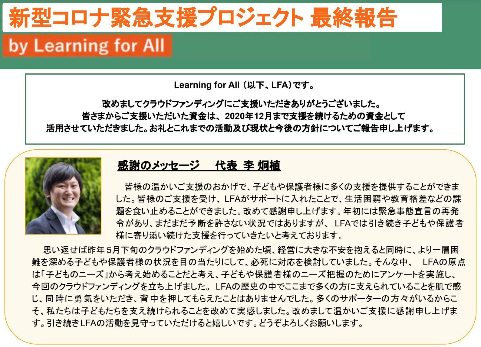 2021/01/19 18:00みなさん、こんにちは。Learning for All (以下、LFA)コミュニティ推進事業部です。1月17日(日)に「新型コロナ緊急支援プロジェクト 成果報告会」をオンラインで開催しました。ご参加いただいた皆さま、ありがとうございました。イベントでもご紹介した「新型コロナ緊急支援プロジェクト 最終報告書」は下記より無料でダウンロードいただけます。「新型コロナ緊急支援プロジェクト 最終報告書」ダウンロードはこちらLFAでは、新型コロナウイルス感染拡大により、多大な影響を受けている子どもたちやその家庭を支えるため、今年4月より「新型コロナ緊急支援プロジェクト by Learning for All 」を立ち上げ、①生活物資の支援②保護者の相談支援③オンライン・オフライン支援④全国学習支援団体へのノウハウ提供の4本柱で支援を行ってまいりました。本プロジェクトの活動資金調達の為にクラウドファンディングで支援を呼びかけさせていただいたところ、5月22日から7月5日までの45日間で571名の方から、総額12,406,095円ものご支援をいただきました。たくさんの方にご寄付いただき、本当にありがとうございした。本イベントでは、クラウドファンディングでご支援いたただいた方や、日頃からLFAを支援してくださっている皆さまに、プロジェクトの成果を報告させていただきました。また、緊急事態宣言が再び発令されるなど新型コロナの影響が長期化している中で、私たちが今後、どのように子どもたちや家庭を支援していくのかについてもお話しをさせていただきました。改めまして温かいご支援いただいた皆さま、そしてイベントにご参加いただいた皆さま、ありがとうございました。イベント内でご報告した内容は、下記の報告書に詳しくまとめております。資料ではコロナ禍でLFAが具体的にどのような支援を行っていたのかを、そして子どもたちの様子なども現場の写真を交えながら記載しておりますので、ぜひご一読くださいませ。※報告書は無料でダウンロードいただけます「新型コロナ緊急支援プロジェクト 最終報告書」ダウンロードはこちらLearning for All ではすべての子どもたちが自分の可能性を信じ、 自分の力で人生を切り拓くことのできる社会の実現を今後も目指して活動してまいります。プロジェクト自体は12月で一区切りとなりましたが、コロナの影響はまだまだ終わりが見えず子どもたちに継続的に支援を届けていく必要があります。皆様からもより一層ご支援をいただけましたら幸いです。▼マンスリーサポーター登録https://learningforall.or.jp/support/※既にマンスリーサポーター登録をいただいている方で、寄付増額をご希望いただける場合は、pr@learningforall.or.jpまでその旨をご連絡いただけますと幸いです。▼使うたびに子どもが笑顔になる『鉛筆』の購入https://learningforall.stores.jp/items/5d46c9c93a7e9619a21efe4b▼子どもたちが作ったLEGO写真『カレンダー』の購入https://learningforall.stores.jp/items/5f8112d5d24eee5e69fcfba7▼Facebookの投稿シェアhttps://www.facebook.com/learningforall/posts/4464492146910559 もっと見る本日開催|新型コロナ緊急支援プロジェクト成果報告会のご案内
