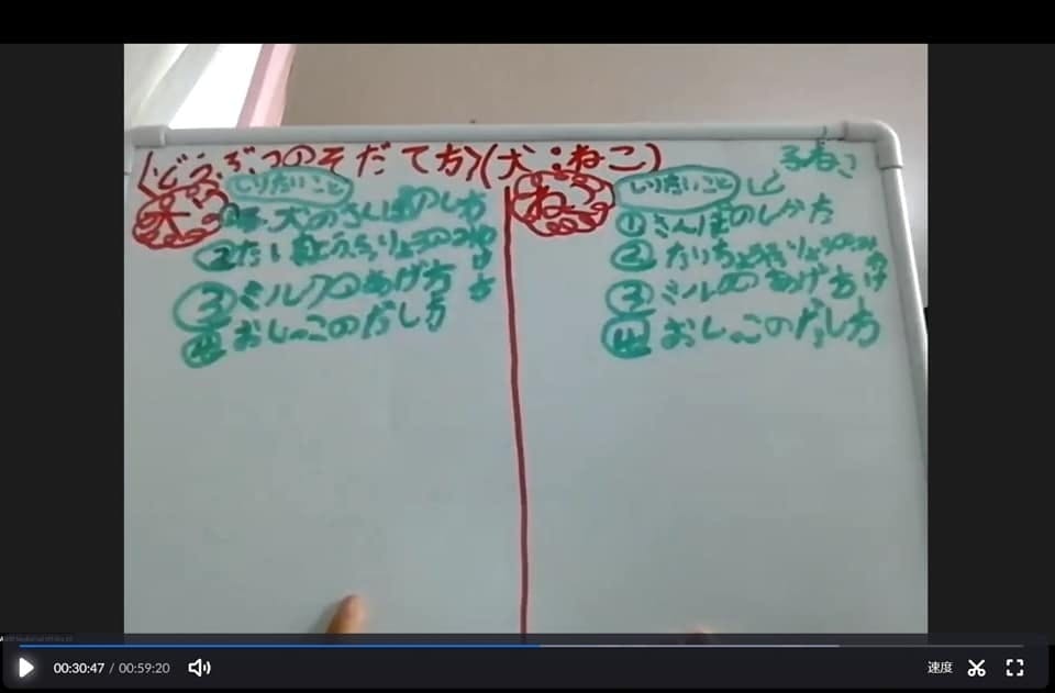 「子猫や子犬の育て方を調べてみよう」という予告出しをした次の週には、「今日はここに考えたことまとめて書くからね!」とリョウくん自ら取り組み、準備万端で臨んでくれたのです。