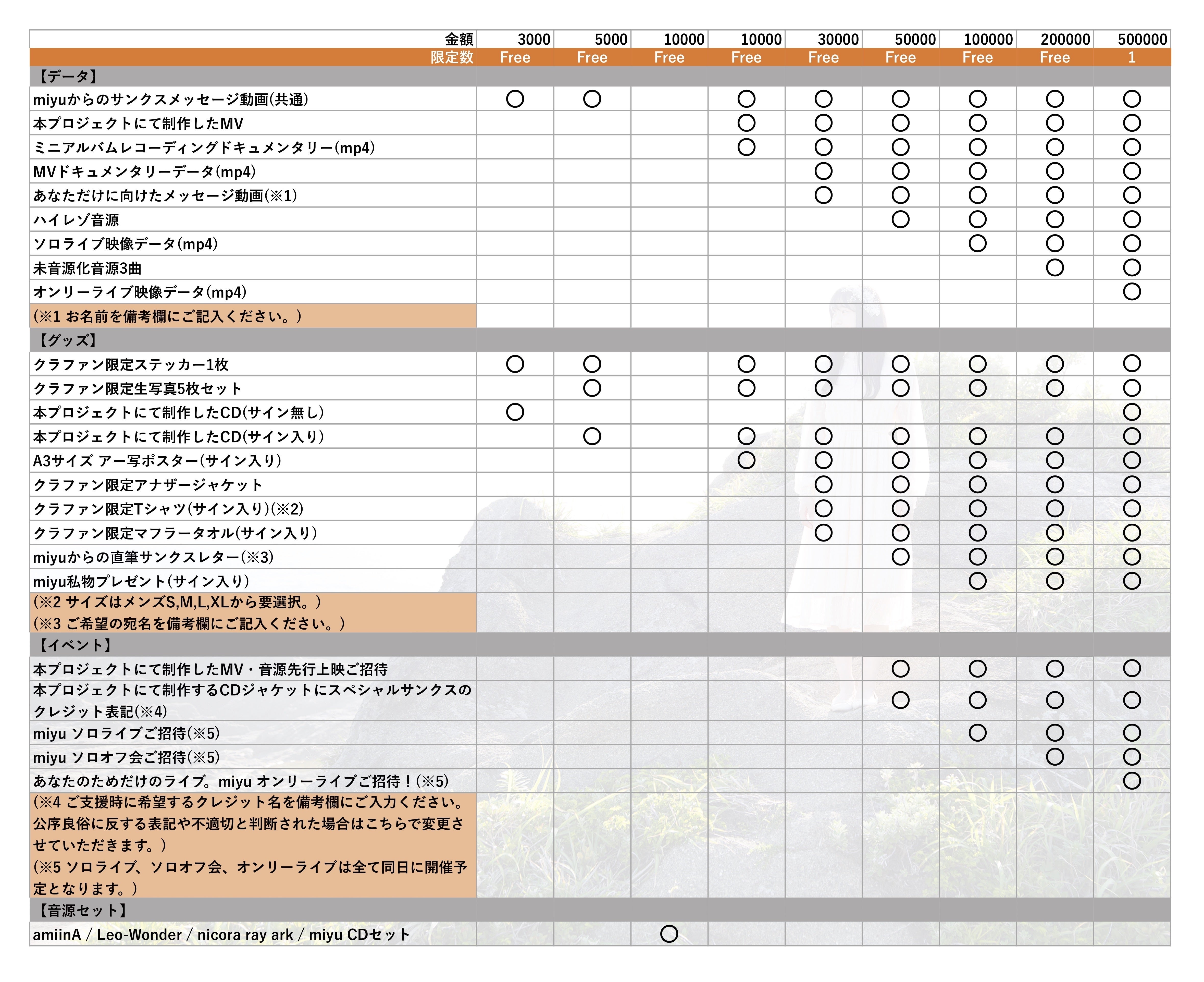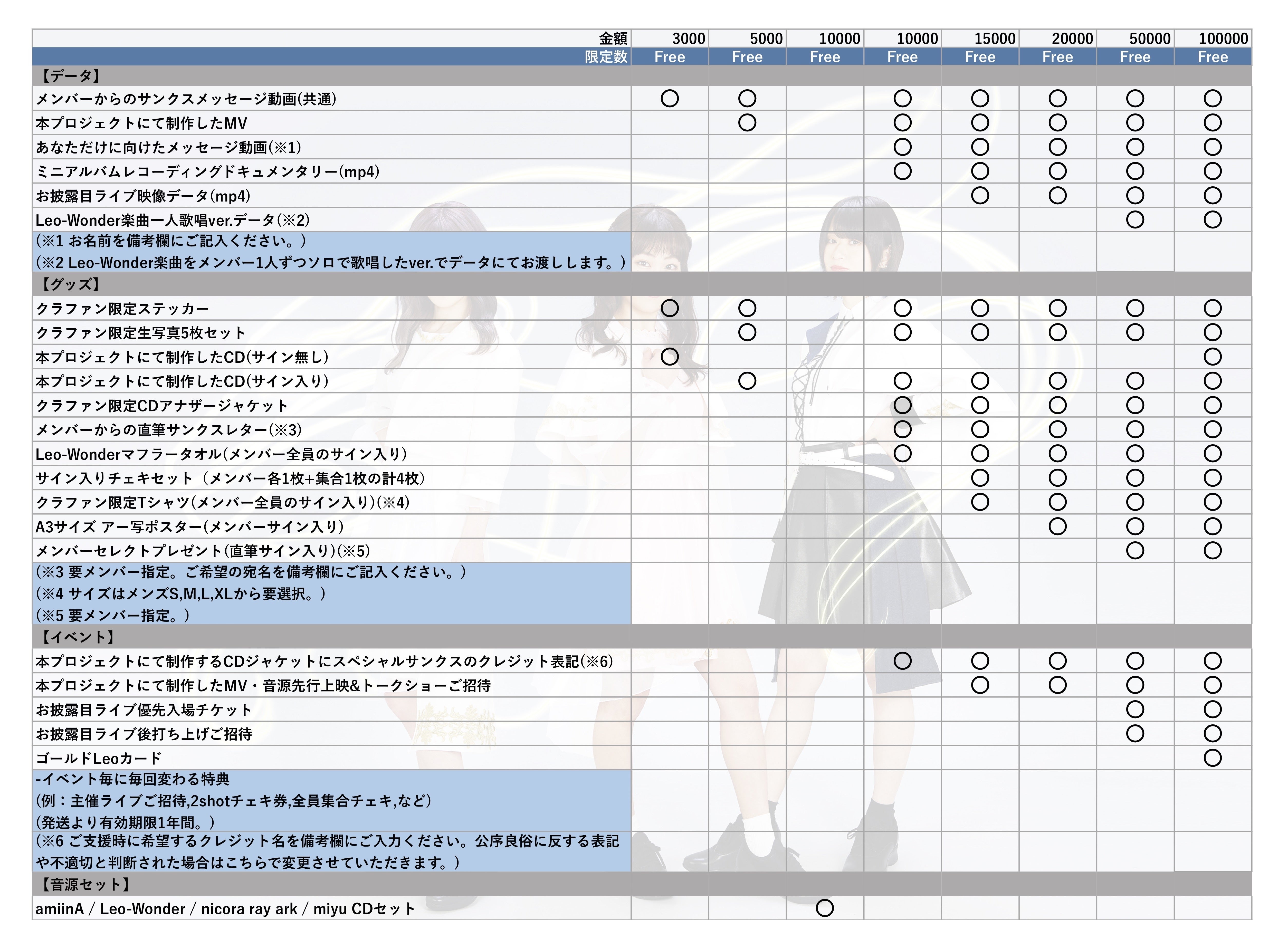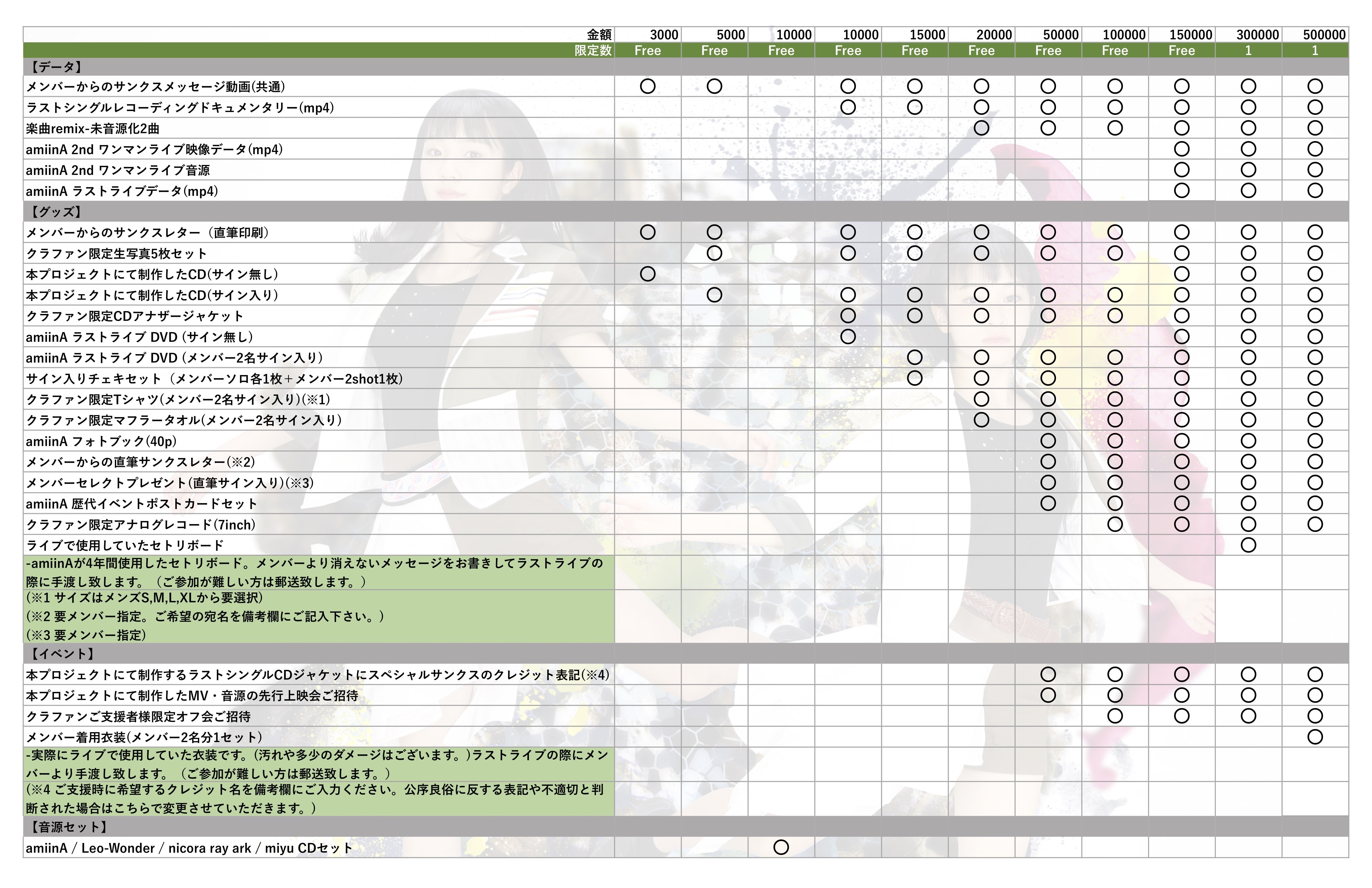 例:主催ライブご招待、優先入場、集合チェキ無料…など毎回特典は変わります。
