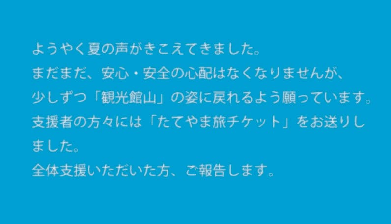 同じような思いで、今を苦しんでいる仲間がいます。そこで、ファンの皆さまに、旅好きなあなたに、館山を愛するあなたに、元気に旅する気持ちになったそのときのために、未来の「館山の旅」を予約していただこう、とプロジェクトを立ち上げました。