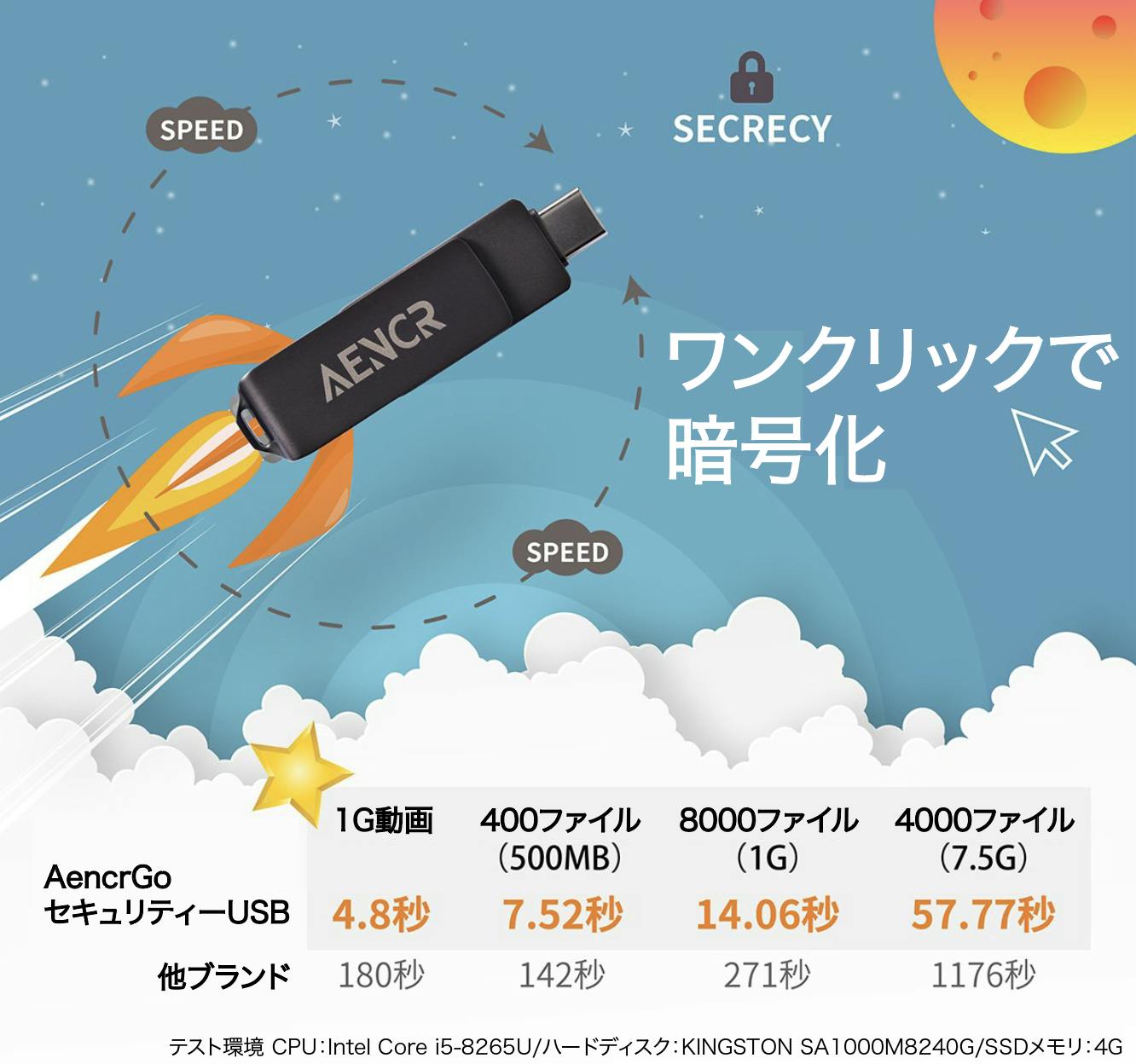 ワンクリックで暗号化が完了し、待機するストレスを軽減できます。独自の高速暗号化チップは、他のブランドの製品と比べ高速です。
