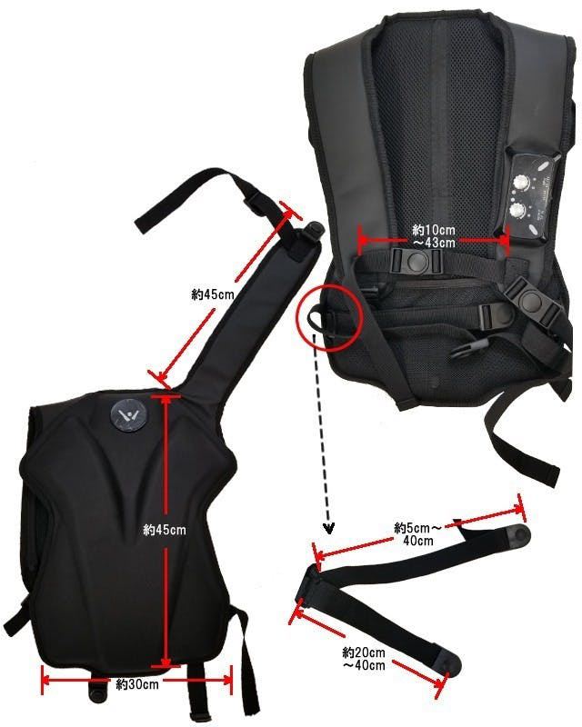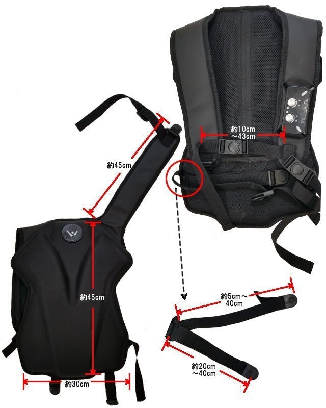 縦ベルト(肩~腰)約40㎝~70㎝、横ベルト1(胸部)約15㎝~50㎝(ベルトのみ)、横ベルト2(腹部)70㎝~105㎝(1周)など、各ベルトは長さの調整が可能なので幅広い体格の方が利用可能です。