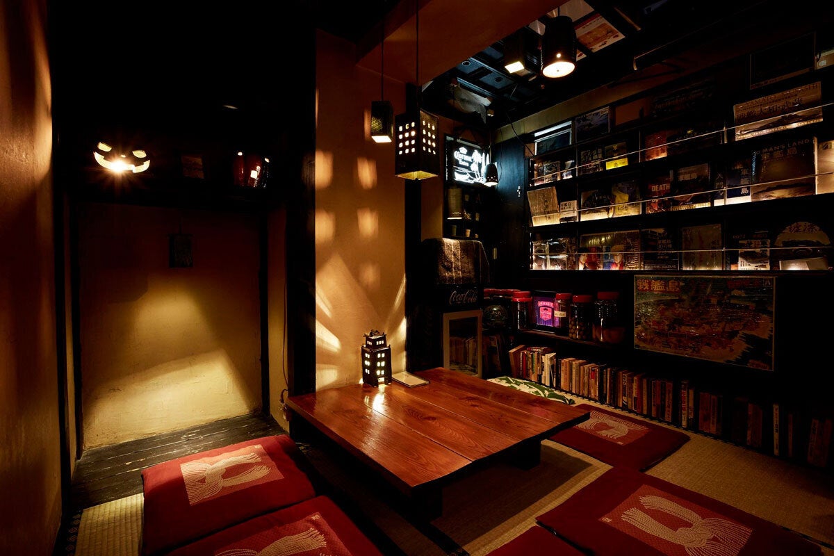創立メンバーの一人が、自転車で日本一周をする際に立ち寄った長崎の廃鉱となった炭鉱の島「軍艦島」 に端を発し、そのイメージをもとに木と陶器を使った座敷のあるバーを仲間で作り上げました。