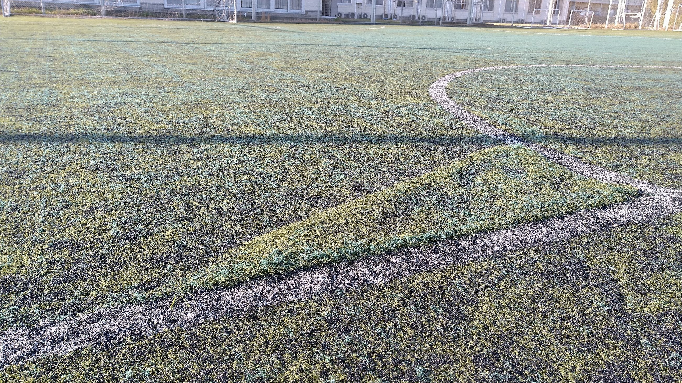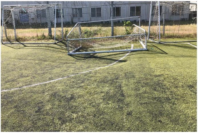 【表面が歪み陥没し、人工芝も荒れた蜂翔寮のグラウンド(2020年5月31日現在の写真) 】