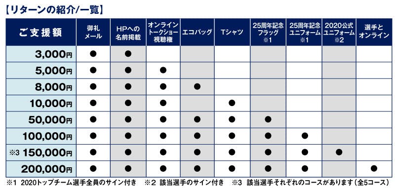 リターンはプロジェクトメンバーを中心に、僕たちの思いに賛同してくれた今シーズンアビスパに所属する全選手、クラブスタッフの方、クラブや選手のイラストデザインを手掛ける「hiroki.38」さんの協力をいただき、ささやかではありますがコースごとに用意させていただきました。