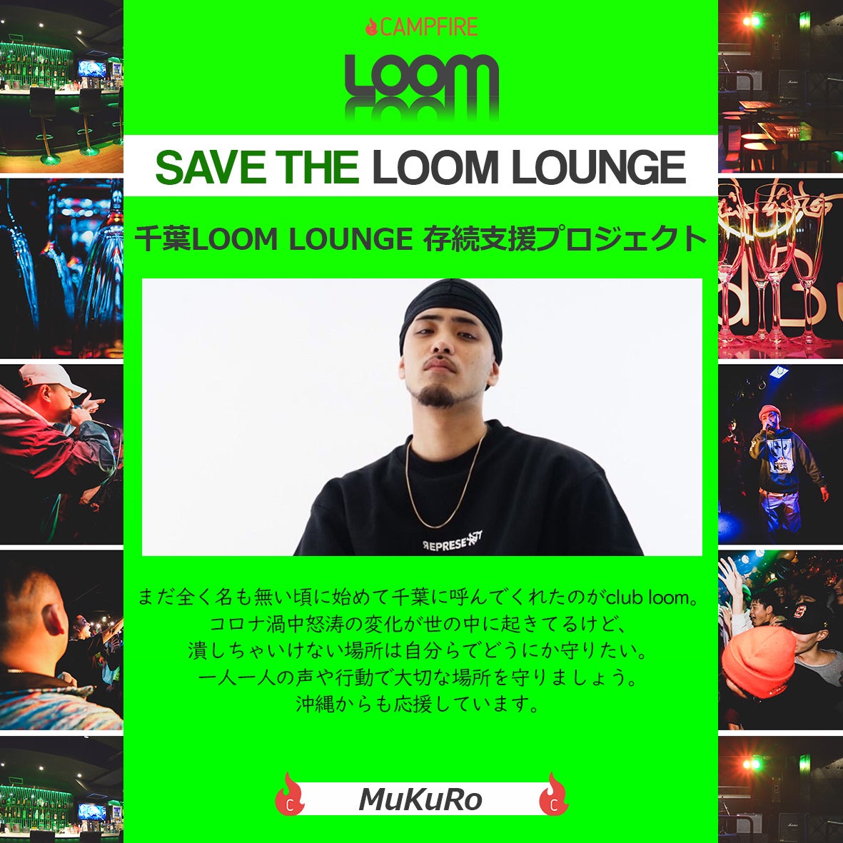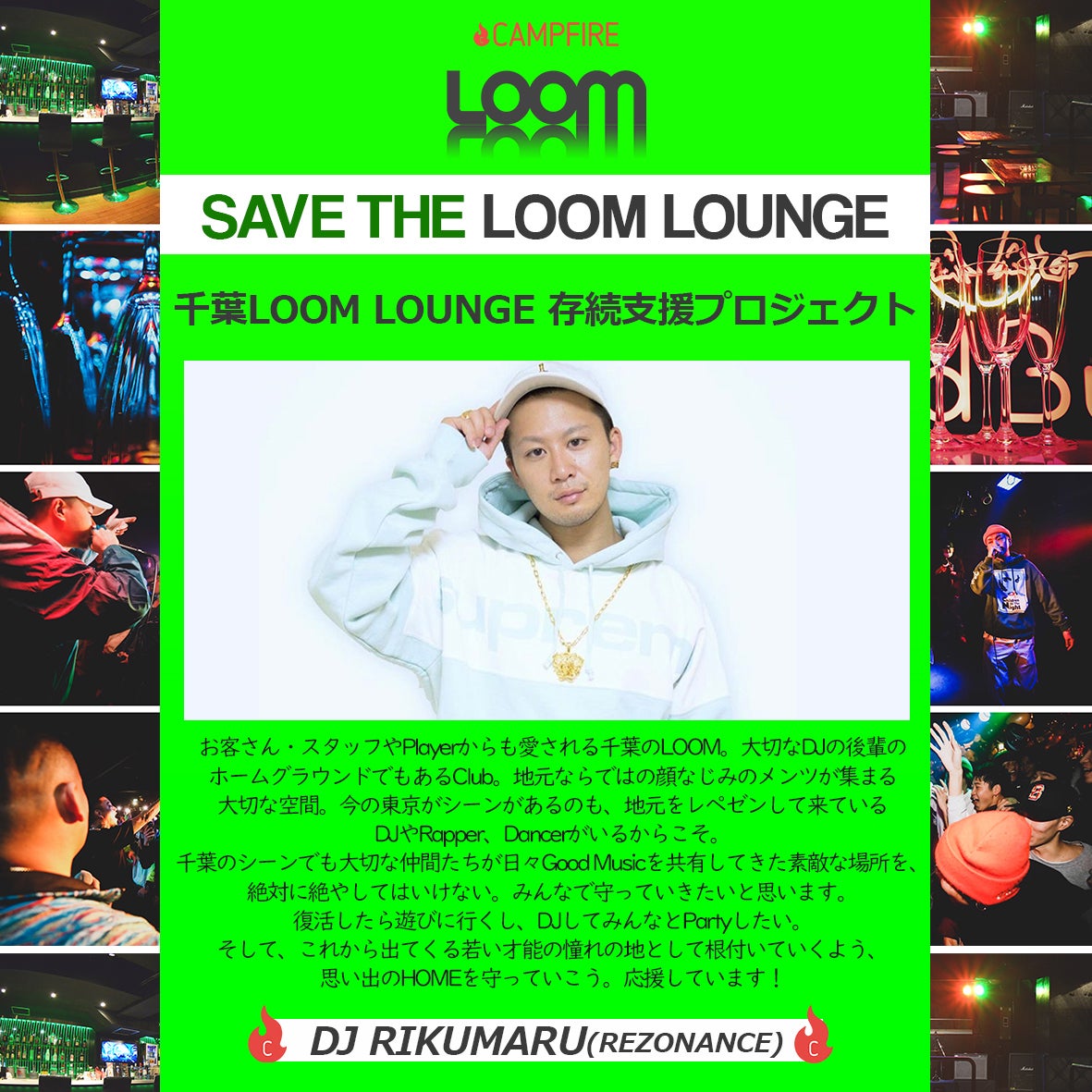 千葉のLOOM LOUNGEが新型コロナウイルスの影響でクラウドファンディング支援プロジェクトを開始して、まず1人でも多くの人に協力して欲しいし、俺自身も出来ることがあれば協力したいって考えて。 そもそも10代から通ってるCLUBで千葉の仲間達と出会えたCLUBで、LIVEをすればいつもあったかく迎えてくれて、朝まで飲んでみんなでご飯を食べてたわいもない会話をして帰る。そんな全てが当たり前じゃなくなるっていうのは正直考えたくないし、だから無くしちゃいけない。 でも1番は千葉は俺自身がまだなにも返せてないって事で、千葉LOOM LOUNGEを無くさないように、みんなで居場所を無くさないよう協力していきたい。 今回SINOKENやユウト、スタッフのみんなが立ち上がってLOOM LOUNGEを守ろうって思う気持ちを、俺もひとつになってちからを合わせていきたいと思うので、皆さんも支援よろしくお願いします!