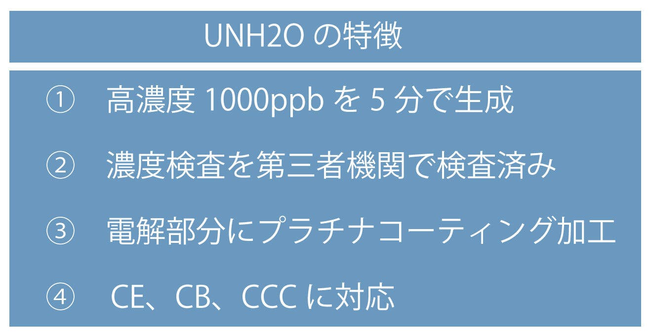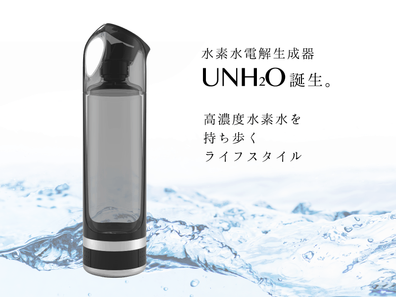 人は一般的に1日に約2リットルの水分を食事以外で摂取する必要があると言われています。水素水を1日に2リットル飲むためには、コストが高く私生活に取り入れるには困難です。そこで、必要なときにすぐに飲めるUNH2Oは、いつものミネラルウォーターをボトルに入れてスイッチを入れるだけで水素水が生成できます。