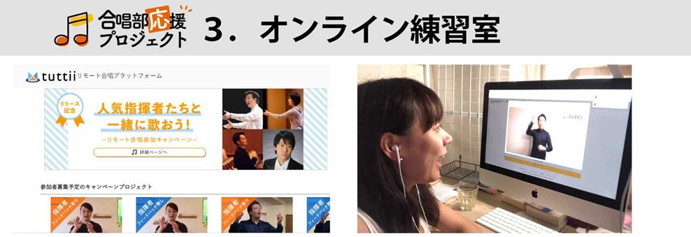 3つ目はオンライン練習室の提供です。合唱部の顧問の先生方のお話を聞いていくなかで、まだ活動を再開できていない学校もかなりの数あることがわかりました。そうした合唱部の皆様に、オンラインでの練習の場として、tuttiiのパート別再生機能や、開発中の自動ミキシング機能をご提供いたします。練習室では、オンライン上で指揮や伴奏を見ながら歌い、その音源をサイトにアップロードすると、それぞれの生徒の歌がミキシングされて、ひとつの合唱になります。