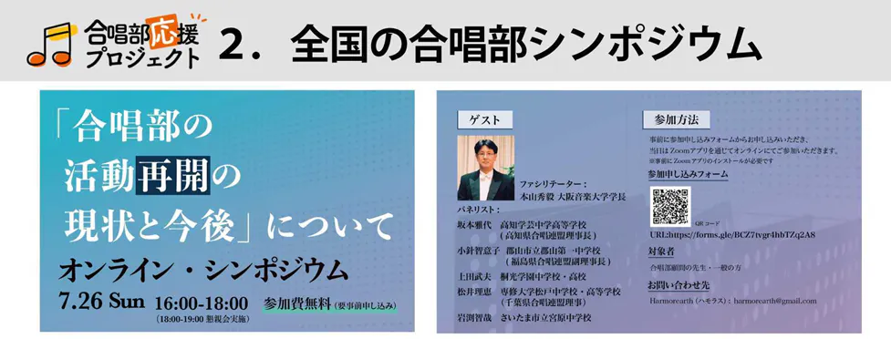 2つ目の活動がオンライン・シンポジウムのイベントの開催です。顧問の先生方と話すなかで、合唱部の活動を再開するためには、非常に大きな苦労や課題があることがわかりました。私たちは、合唱部顧問の先生方に、そうした問題をわかちあい、より良い合唱部の活動を行うヒントを得ていただける場を提供することで、先生方をサポートしています。7月26日のシンポジウムには、100名以上の方にお申し込みいただきました。