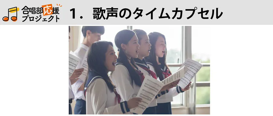 1つ目は「歌声のタイムカプセル」です。2020年の今しかいないメンバーの合唱・歌声を高いクオリティで録音して、生徒の皆さんの思い出として残していっていただければと考えております。これは集まって歌っても、リモートで歌ってもどちらでもOK。それぞれの学校の状況に合わせて参加して欲しいと考えています。皆さんの状況に応じて最善の録音方法を提案させていただきます。