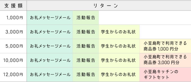 ※今回は第一弾として、小豆島町奨学金制度利用学生を対象としております。この制度は、卒業後町内に住居を有し、 小豆郡内事業所に就業する場合、その返還が猶予される制度です。 小豆島に帰ってきて就職をしようと 考えている学生が多いので 小豆島の未来を背負う学生たちです! そんな彼等、彼女たちを応援するために 多くのご支援をよろしくお願いします。