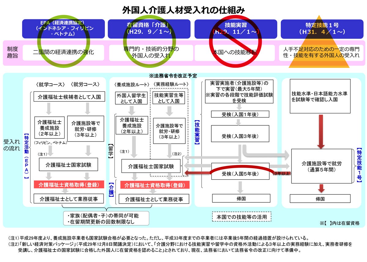 上記の表の通り、外国人介護人ざいの主な受入方法は4通りありますが、当法人では、ただ人ざいを確保するという観点は排除し、福祉・医療について学び、働きたいと考えている意識の高い外国人留学生を支援していきます。