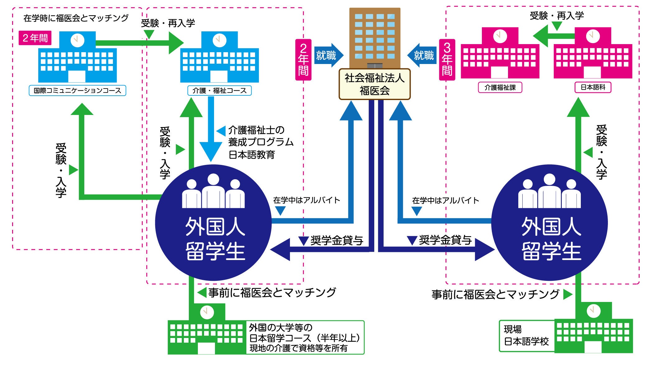 福医会では、継続して安定した地域福祉を提供したいと考え当プロジェクトを当法人・教育機関・民間企業と一体的に取り組むプロジョクトを2019年度より開始いたしました。このプロジョクトは昨今耳にする機会が多くなった外国人技能実習制度を活用するものではありません。外国人技能実習制度は最大5年間日本の就業を通して技術を習得し母国に持ち帰ることで母国の発展につなげるという仕組みではありますが実質的に一部の業種の労働力となっているケースがあり、一時的な労働者と言わざるを得ない場面もあります。法人ではあくまで日本の将来、地方に想定される労働人口の枯渇による様々な仕組みが機能しなくなることへの懸念解消が目的であり、地域における”人ざい育成”が根底です。