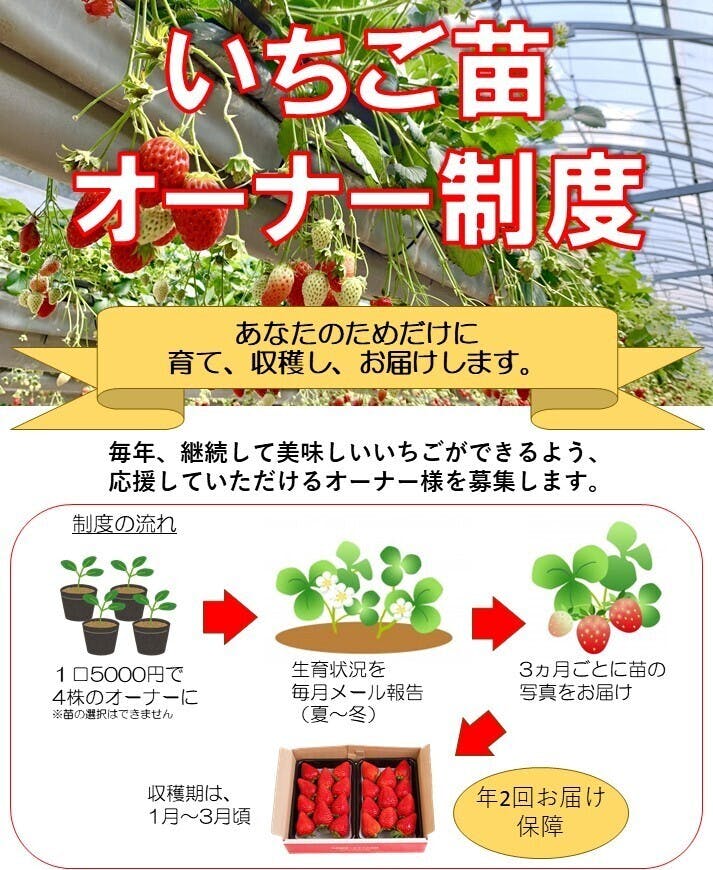 …いちご苗オーナー権(毎月のメール報告・3ヵ月に1回の写真付き手紙報告・朝採りいちご2回発送)といちごぷりん10個入、感謝の手紙をお送り致します。