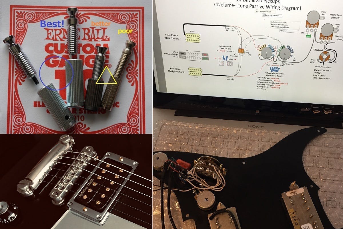 ・レスポール系ギターに採用されているブリッジやフロイドローズなどのトレモロブリッジに関しては、弦の振動を効果的にボディに伝えるために調整後、可動部が固定出来る部品を選択し、響き/鳴りを向上させています。