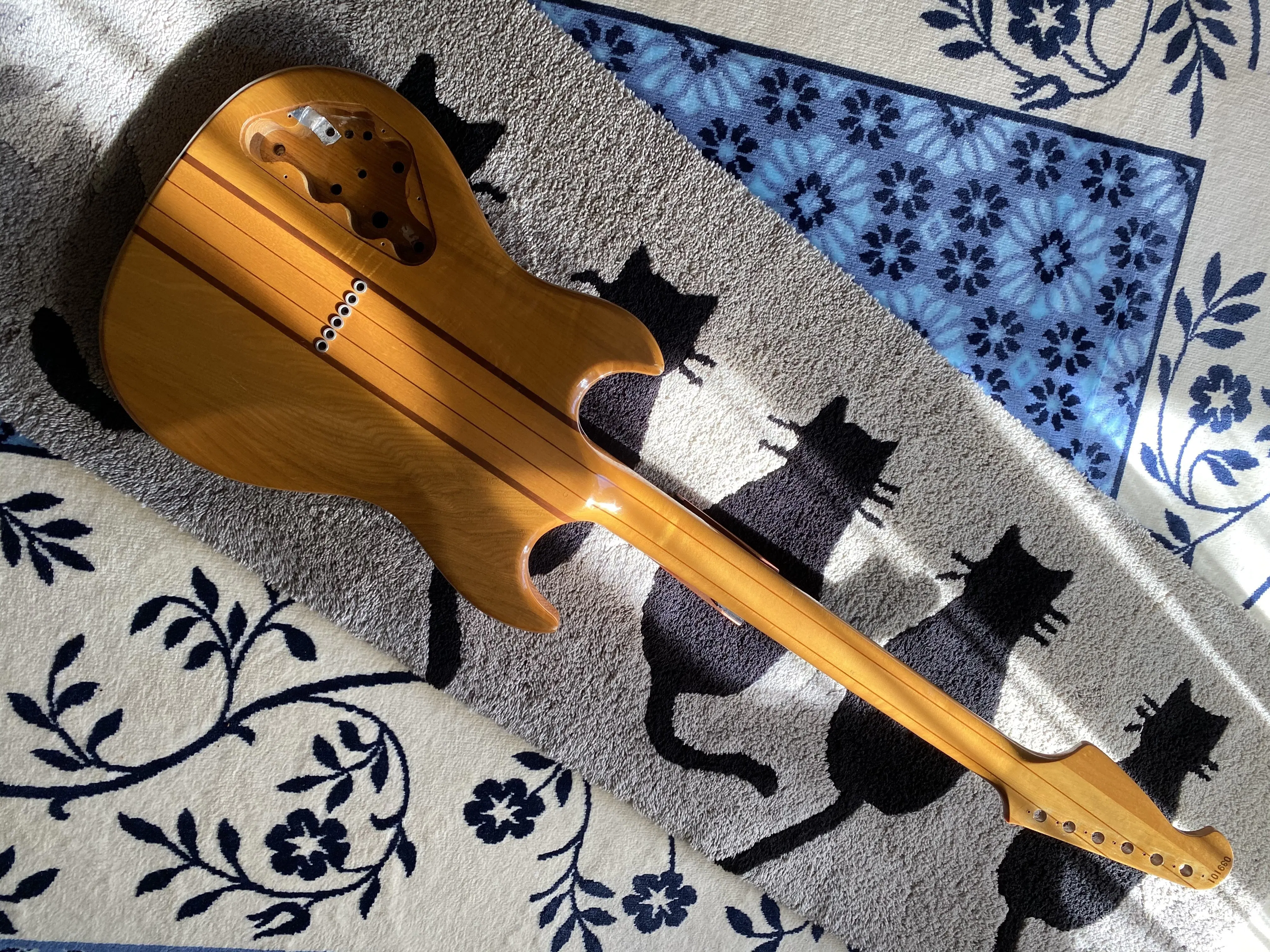 塗装をはがしてみると見事なワンピース(一枚板)のボディが出てきました。ボディ/ネックはオイルフィニッシュで磨き上げ、パーツはすべて交換、まさにリビルド。