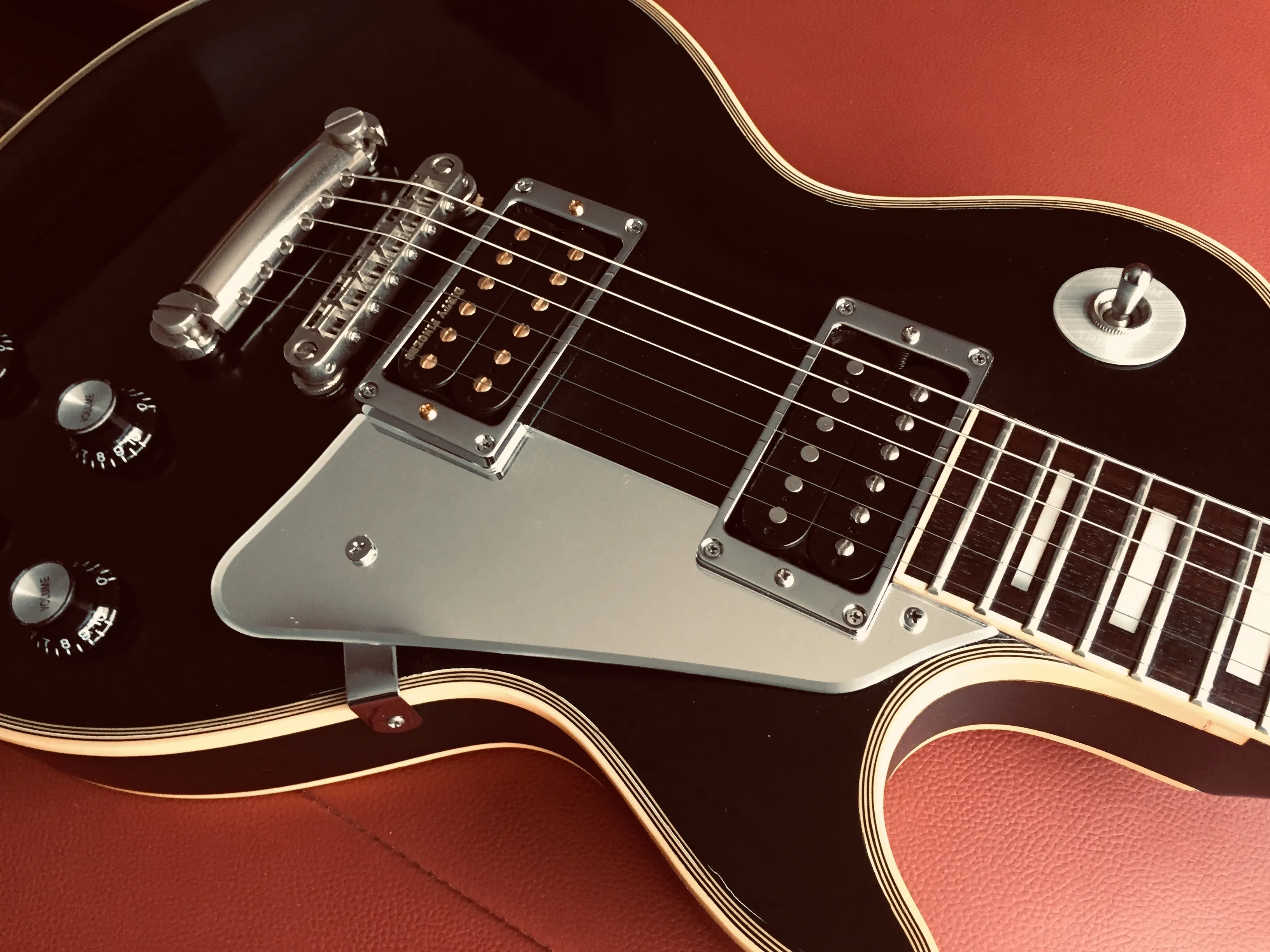 プロジェクト冒頭の写真はG社直系の Made in Japan モデルですが、これは Aria Pro II の Les Paul Custom です。ピックアップをしっかりと支えるためにエスカッションを金属製に変えることが Mid-Night Music Communications 流。この写真をご覧になると John Sykes 氏の Les Paul Custom を思い出す方もいらっしゃるでしょう。そのモデルをモチーフにピックアップセレクタ周りも金属部品へ交換し、ブリッジを固定できる部品を採用して振動を効果的にボディへ。抜かりはありません。
