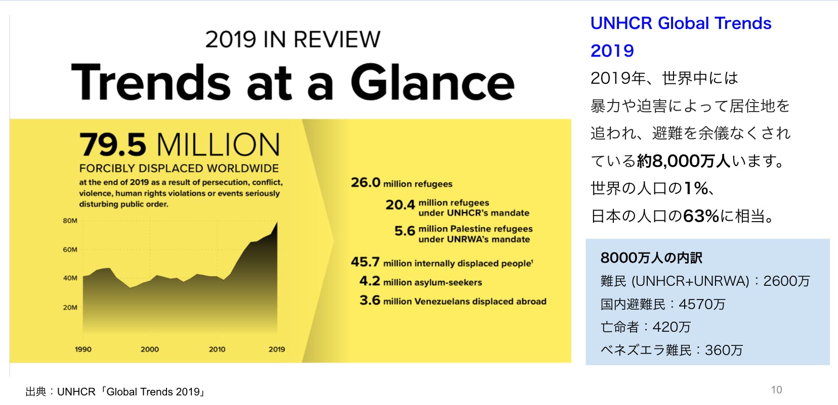 国連難民高等弁務官事務所(UNHCR:The Office of the United Nations High Commissioner for Refugees)の報告によると、2018年時点で、紛争や迫害により故郷を追われた難民の数は7000万人を超えており(国内避難民:4130万人、国外に逃れた難民:2590万人、庇護申請者:350万人)、そのうちの約半数はこどもたちです。