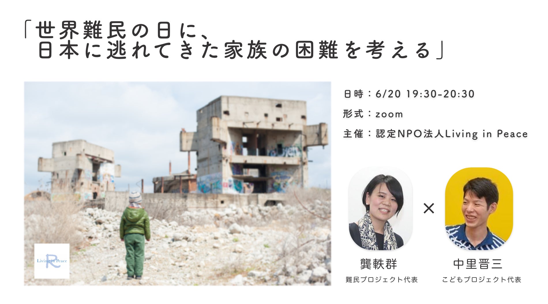 Living in Peace難民プロジェクト代表理事の龔軼群と、こどもプロジェクト代表理事の中里晋三が語り手となり、難民問題を家族という切り口で日本の難民問題を考えていきます。