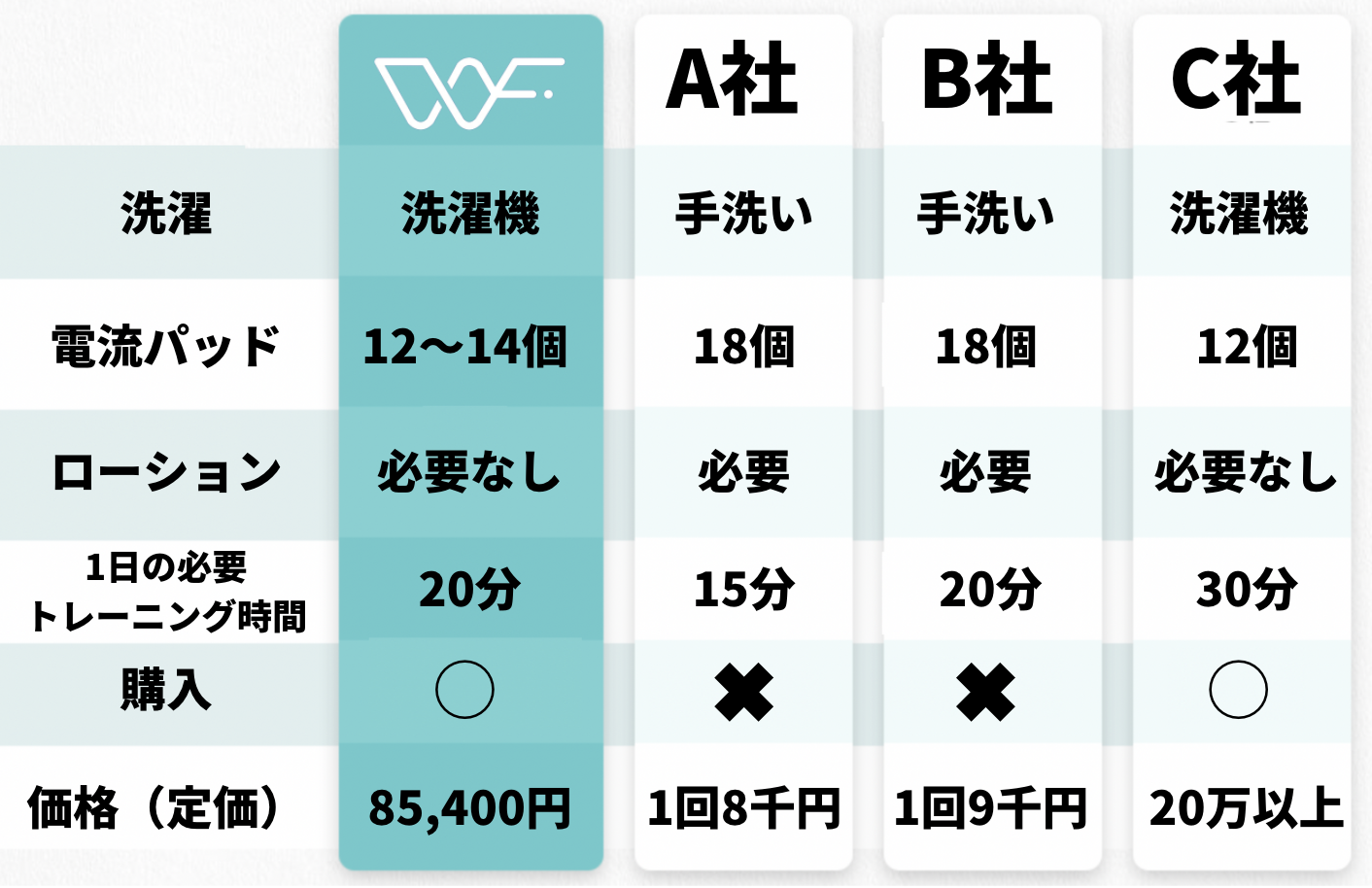 WisenFitはそれらの必要がありません。追加費用は一切かからず継続的に、どこでもEMSトレーニングが可能です。