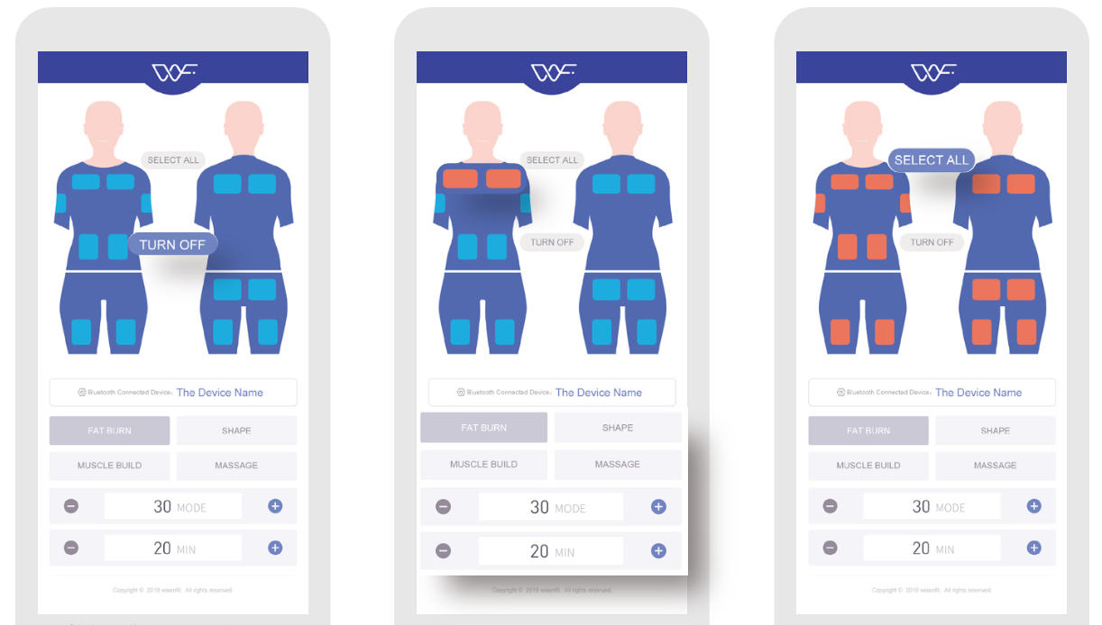 ③スマホとWisenFitをBluetoothで接続し、専用のアプリケーションからの操作で電流パッドを操作します。アプリでは強弱の調整(50段階)、トレーニング時間の設定、トレーニングモードの選択等が可能です。