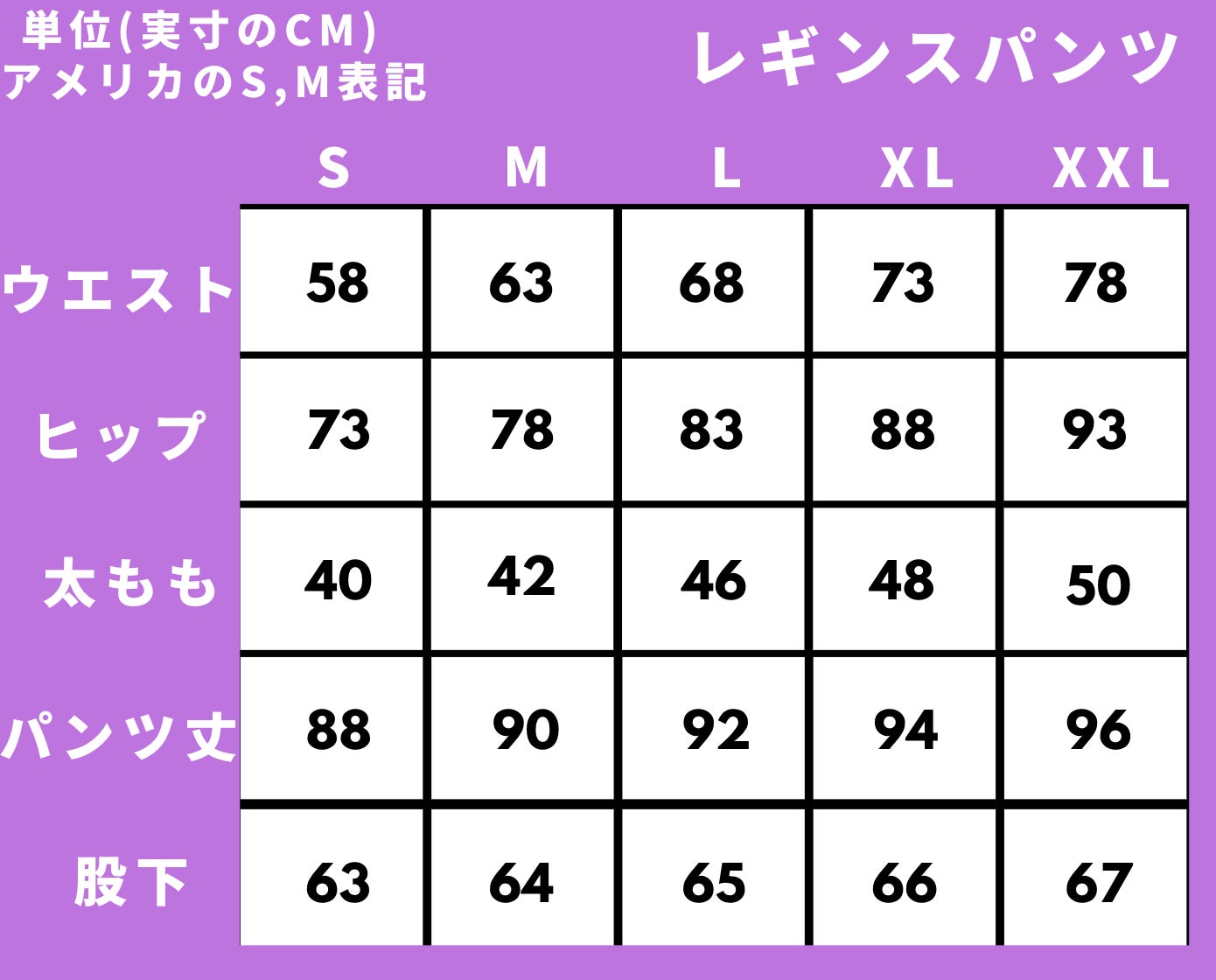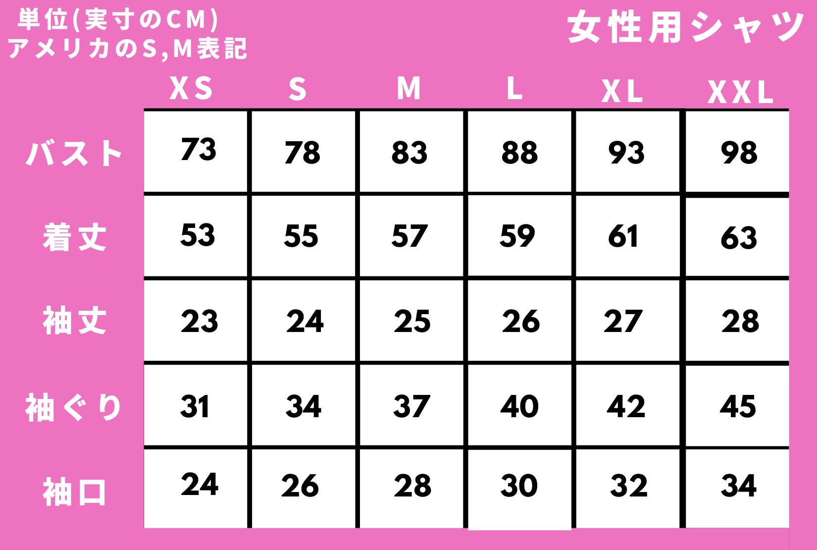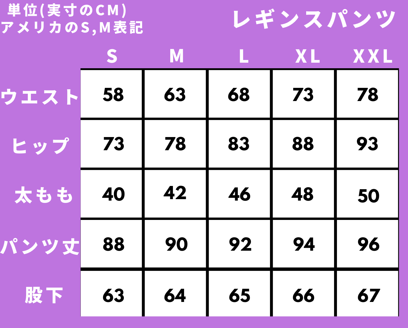 ※サイズ表は実寸(平置きの寸法×2)で表示しています。全方向に5cm以上伸縮する素材を使用しています。サイズはアメリカのS,M表記になっています。