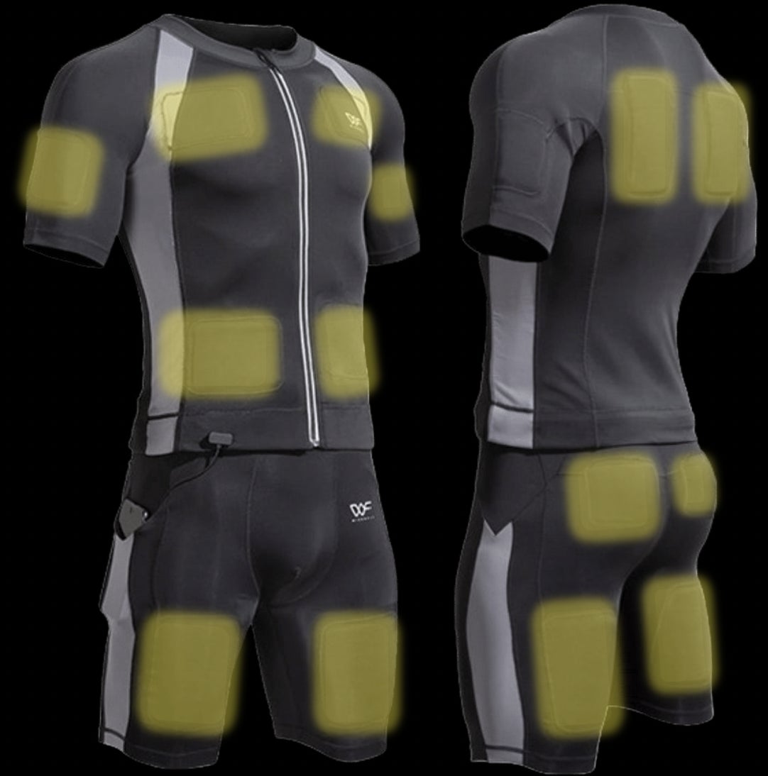 EMSスーツ男性用は上半身に8つ、下半身に6つ合計14個のパッドを搭載(腕、胸、腹部、背中、太もも、お尻、裏もも 各2つ)
