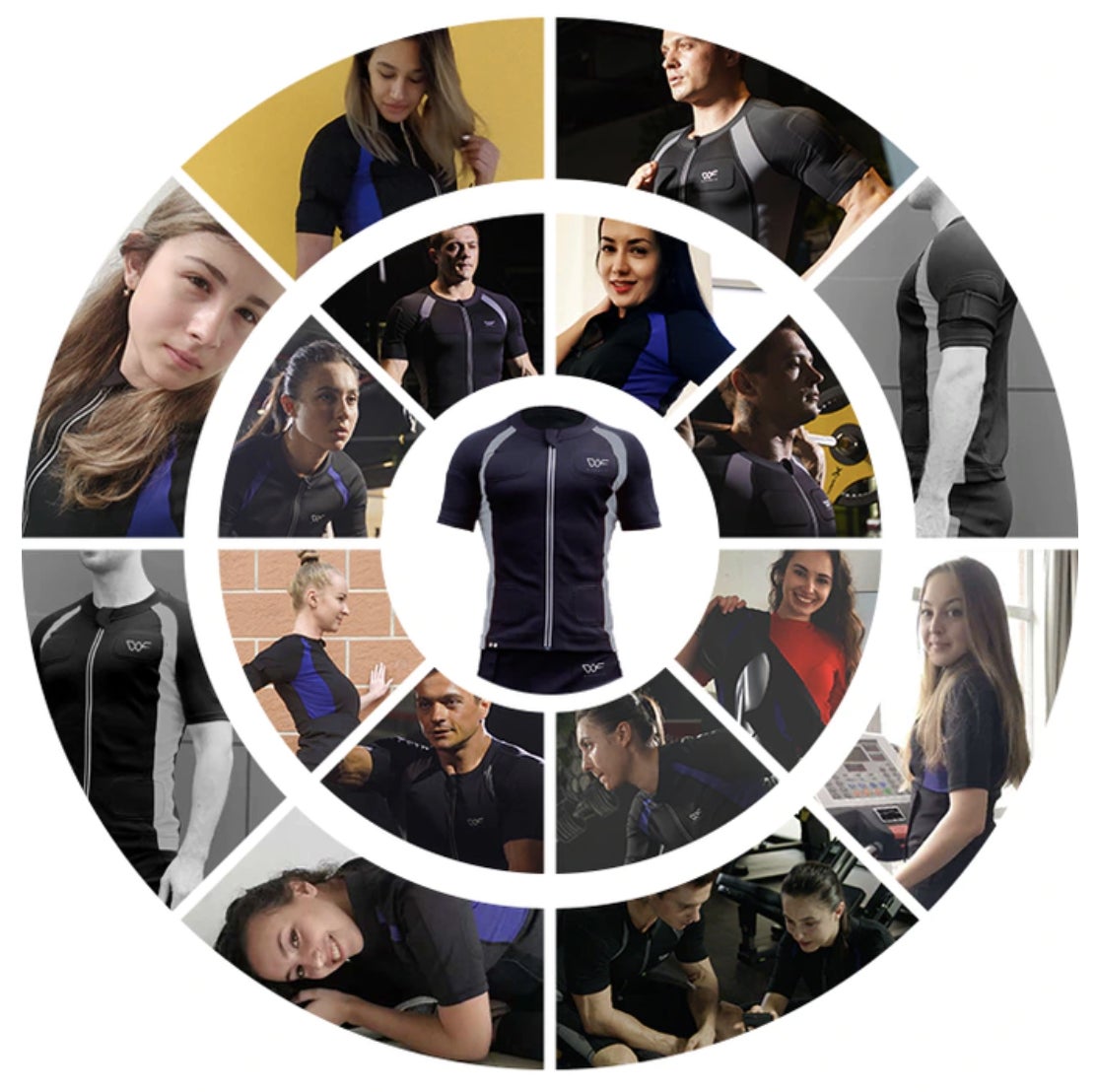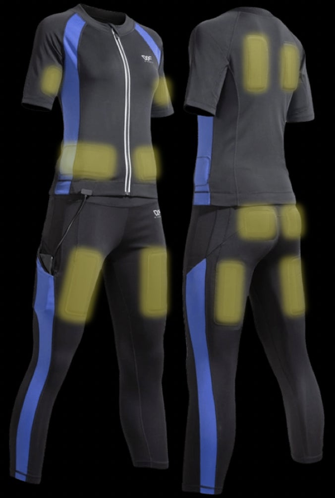 EMSスーツ女性用は上半身に6つ、下半身に6つ合計12個のパッドを搭載(腕、腹部、背中、太もも、お尻、裏もも 各2つ)