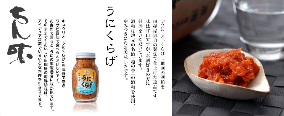 - うにとくらげ、地元酒蔵の酒粕を使い田塚屋独特の製法で仕上げた逸品です。酒の肴にご好評いただいております。キュウリと一緒にのりに包んでワサビ醤油で食べると最高です! / 賞味期限3か月