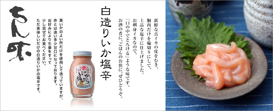 - いかの皮を除去していかの身の良いところだけを使った上品な塩辛です。甘口のためか女性の方に人気がございます。ご家族皆様でお召し上がりいただける塩辛です。 / 賞味期限30日
