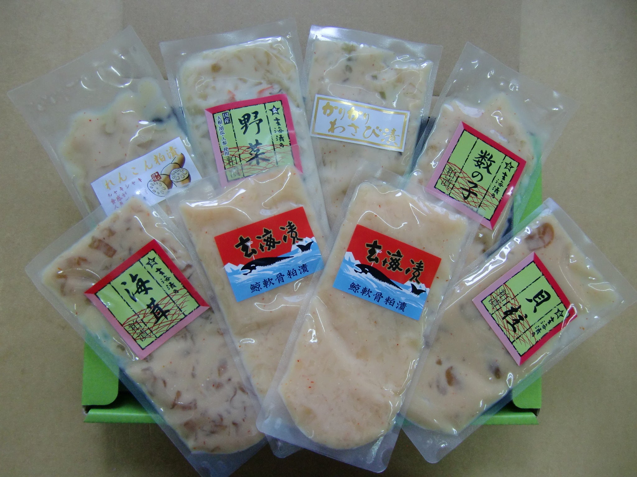 玄海漬(鯨軟骨粕漬)120g×2・貝柱粕漬120g・海茸粕漬120g・数の子粕漬120g・蓮根粕漬120g・野菜粕漬120g・かりかりわさび漬120g