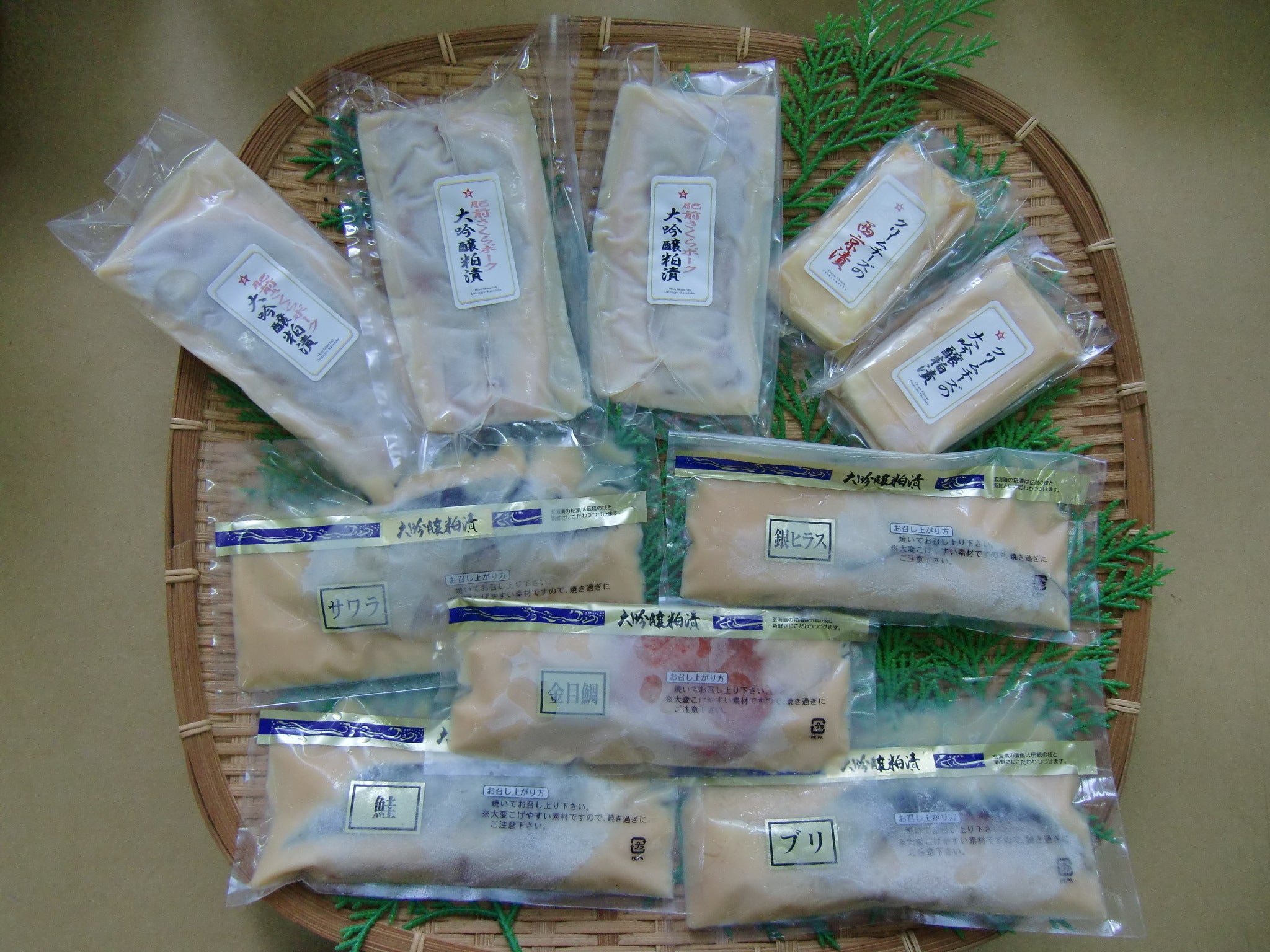肥前さくらポーク大吟醸粕漬3枚・さわら大吟醸粕漬1枚・金目鯛大吟醸粕漬1枚・銀ヒラス大吟醸粕漬1枚・鮭大吟醸粕漬1枚・ブリ大吟醸粕漬1枚