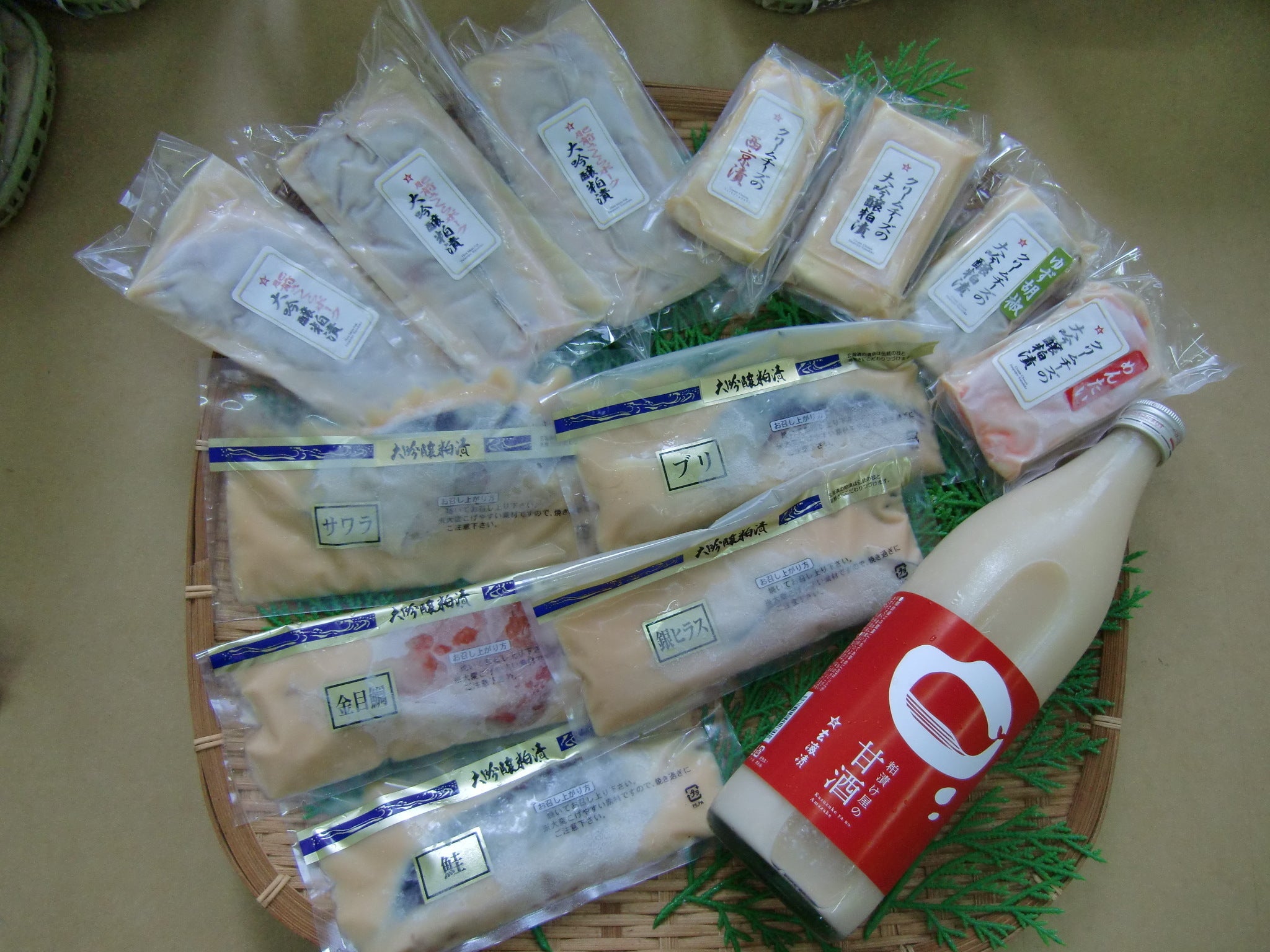 ・クリームチーズ大吟醸粕漬1枚・クリームチーズ西京漬1枚・ゆず胡椒クリームチーズ大吟醸粕漬1枚・めんたいクリームチーズ大吟醸粕漬1枚・酒粕入り甘酒900ml・ドライフルーツの粕漬3種類(りんご、パイン、キウイ)各1個