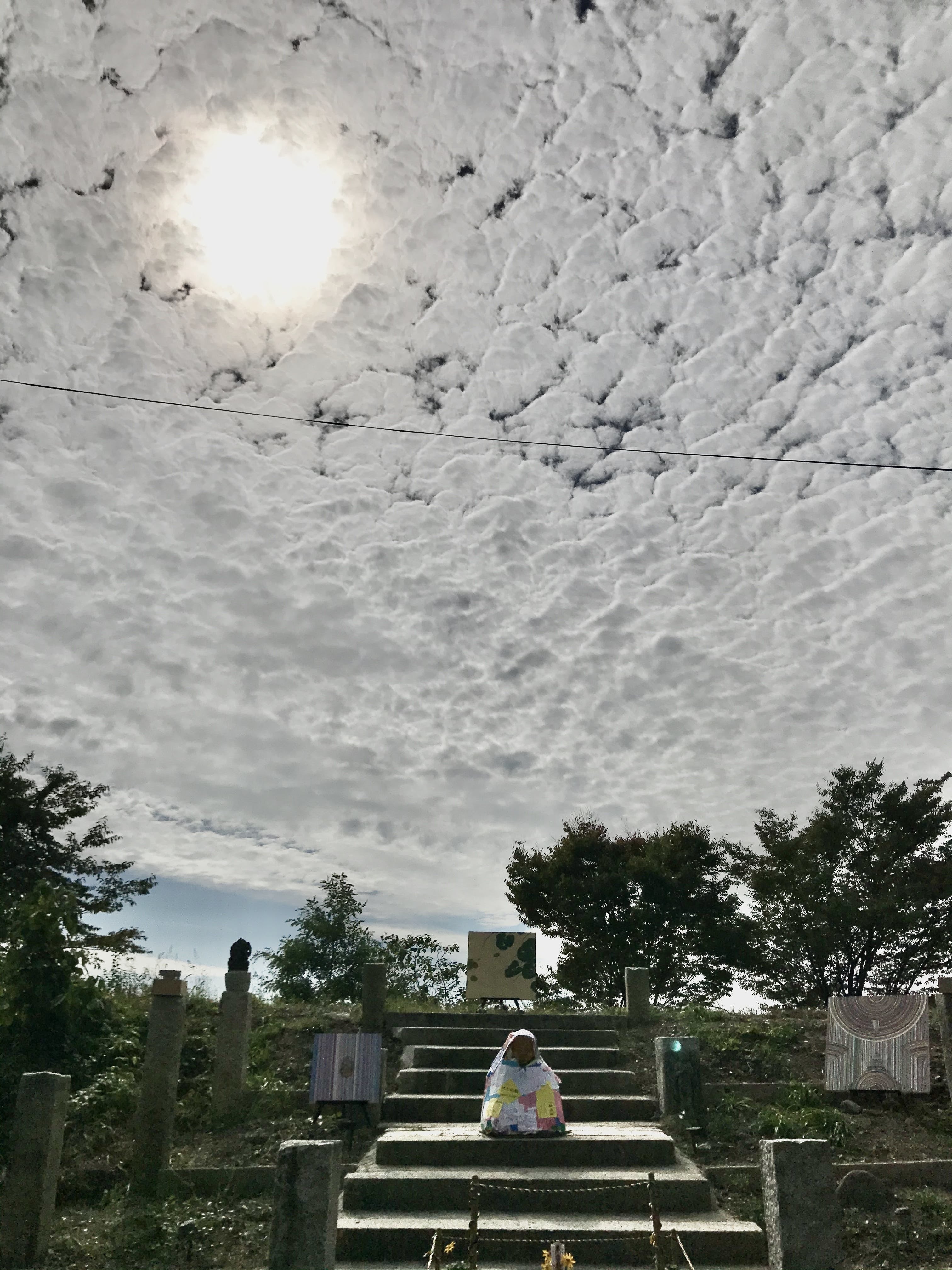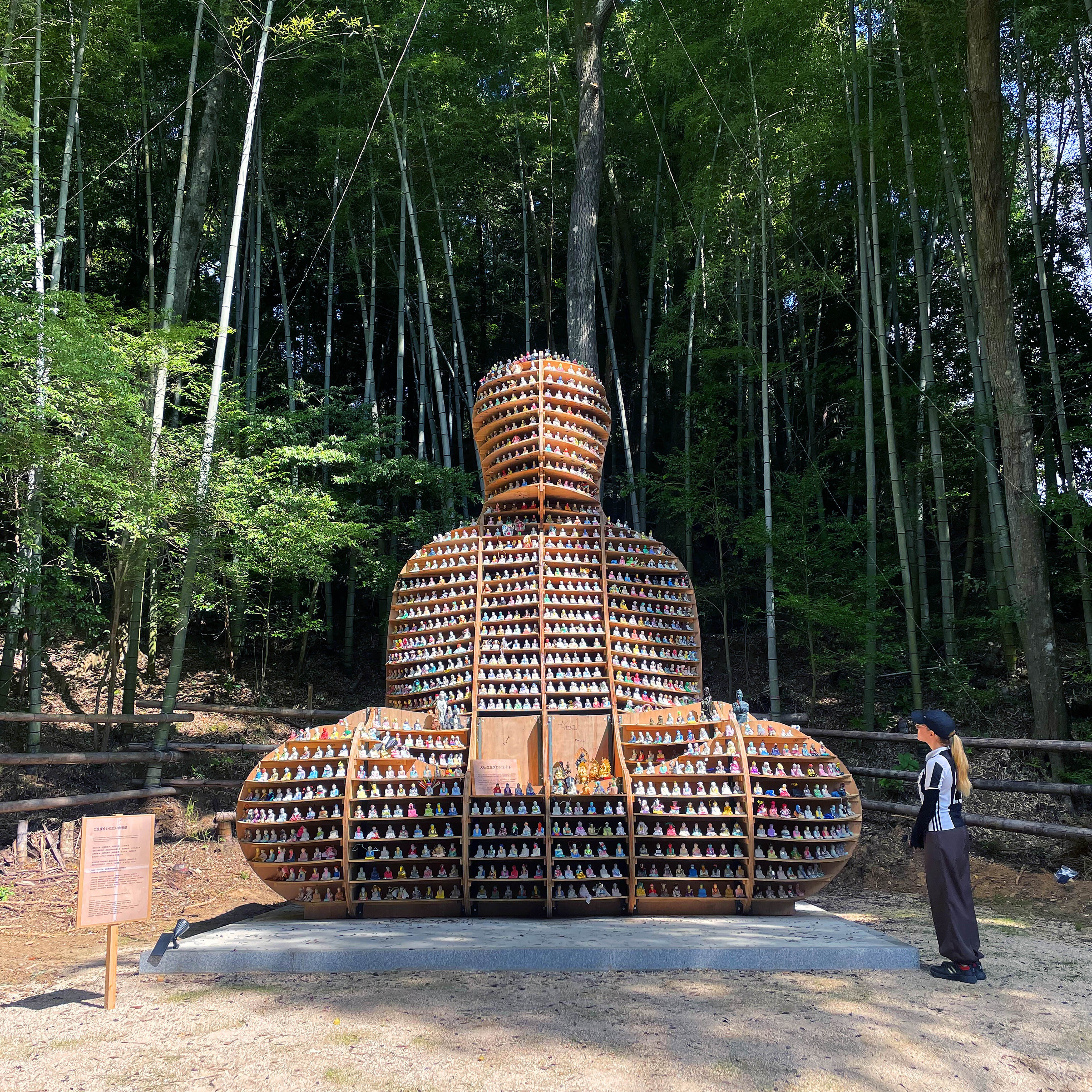 2024/09/08 14:21「大仏安置までの道のり1」のつづき8/30(金) 豪雨→ 晴今日は一日中スコールなので、屋根のあるところで棚板を選別したりして、すぐに設営作業を再開できるように下準備。また、明日は芸術祭初日の上に、「開眼法要」と「ガクさん(陶芸家)の仏前結婚式」もあるため、洞春寺山内は、それぞれが大忙し。山口市内は厳戒態勢で、配達業者もすべて営業停止しているため、問い合わせもできない。明日からのワークショップに必要な道具も届かないので、急遽100均に買い出しにいくが、営業停止のお店が多数。とにかく荷物が届かないと進められないこともあり、対策に追われる。まだまだ大仏が不安定な状態なので、ずっと暴風を心配していたが、どうやら台風は逸れて弱まってくれたらしい。雨の上がった夜中に、近所のマックへ走る。ブンちゃんたちが作ってくれる一汁一菜はホントに美味しいのだけど、そろそろジャンクを接種しないと体力がもたない。8/31(土) 快晴朝から天気は晴れ渡り、昨日までの嵐が嘘のよう。札幌から送ったミニ大仏14箱も2日遅れで到着し、一安心。前日の話し合いで、「開眼法要と大仏設営を同時並行で進める」ことに決定。開眼法要は深野住職の導師のもと、ケンさん、フッさん、ブンちゃん、風間は僧侶側に。前田さん、川西くん、ニイさんは、ある種のパフォーマーとして大仏設営側に。やっと再開できた大仏設営は、「開眼法要」中になんとか足部分を取り付けられるまでに進む。法要後に、TVなどのインタビューを受ける。たしか17:45から5チャンネル(yab)で放映予定だったけど、すっかり忘れてた。そもそも洞春寺の居間にあるTVは、いつも点いていないし。今日からスタートした「水の上芸術祭」は大盛況。「公開仏前結婚式」が開催された事もあり、お寺全体がお祝いムードに。昔はお寺でよくやっていた「餅まき」は、やはりメチャクチャ盛り上がる。ご開帳中の観音様(重要文化財)前で実施したミニ大仏ワークショップにも、沢山の人が来てくれて、新たなミニ大仏が33体。9/1(日) 快晴今日は大仏前で深野住職の「生前葬」を実施。さすが、いつもユニークな深野さんの葬儀なだけあって、法要中に何度も笑いが起きる。それが「誰の葬儀なのか」が、参列者にも明確に伝わる。それが生前葬の特徴。大仏自体はやっと棚板をつける準備ができて、昨日スカウトしたコウノさん(洞春寺敷地内にある児童養護施設の職員)も一日中手伝ってくれたお陰で、明日には完成できそうな所まで進む。午前中だけの予定だったミニ大仏ワークショップは午後にも延長して、新たなミニ大仏は更に36体。2日間で69体のミニ大仏が誕生。風間は北海道に戻らねばならず、離脱。帰還直前に、大仏設営中ずっとカメラを回してくれていたハイジ(オランダ人アーティスト)のインタビューに答える。9/2(月) 晴土台となる部材が組み上がり、何百とある棚板を1枚ずつ、選別しながら打ちつけていく。台風天候と打って変わった猛暑の中での作業。今日の作業は昨日から引き続き、ニイさん、コウノさん、ブンちゃんが来てくれる。ニイさんは木こりの技術を活用し、木の枝からロープを垂らしたプロの高所作業。コウノさんが持ってきてくれた「スライダー式はしご」も必須道具。全国を共にまわって想いを集めてきた1mほどの「勧進仏像」は、大仏の中に入れる「お内仏」として左足部分に収納。洞春寺のお檀家さんから奉納された「仏舎利 (ブッダの骨)」も中心に収納。作業は夜まで続き、ケンさんが持ってきてくれた夕飯は大仏の中で食べる。竹林の中に浮かび上がる「夜の大仏」はとても幻想的。これでやっと組み立て作業は完了し、あとは明日「ミニ大仏」を並べていけば、、完成!9/3(火) 晴朝早くから、芸術祭の出展アーティストや洞春寺に滞在している方々にも手伝ってもらい、約1300体のミニ大仏を並べていく。クラウドファンディングをはじめとした、出資者のお名前を明記した看板も打ちつけ。(今回の木札は仮のもので、新たに制作します。)プロジェクトの最終局面、7日間の「大仏安置までの道のり」がやっと完了します。前田さんも川西くんも今日中に帰らなければいけないので、高い所に載せるのは後日ニイさんにお願いすることに。細かいところまでチェックができていないので、今月中に改めて「洞春寺」伺う予定です。9/28(土)に、改めて洞春寺観音堂にてワークショップも実施予定なので、お近くの方はぜひ! もっと見る