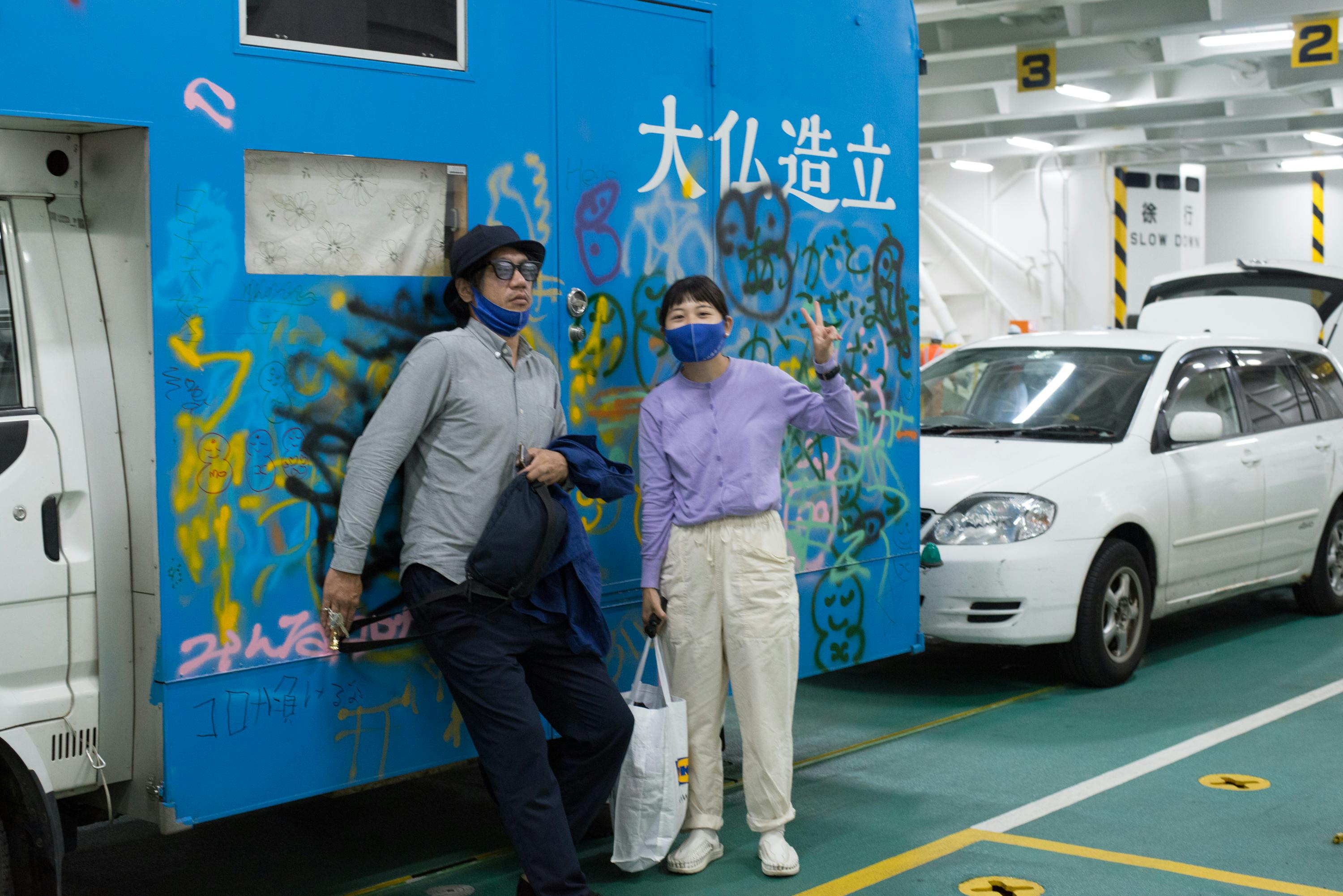 ライブ配信では途中から対談をはじめたので、その進行役も。今回「大仏カー」だけではスタッフと荷物を載せきれないため、乗用車を併走させています。僕はこの乗用車の1台を運転しています。