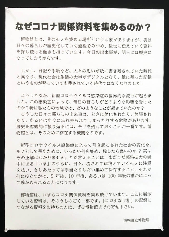 もともと浦幌町立博物館では「新聞の折込チラシ」を収集していて、今回のチラシ収集もその延長線上にはあるのですが、震災の記憶が薄れてきていることなどを憂慮して、「記憶の風化を防ぐ」という目的を持ってコロナ関連の紙媒体を集めているそうです。これまで世界で起こってきたパンデミックの記録はたくさん残残っているのですが、市民生活の記録はほとんど残っていないらしいのです。