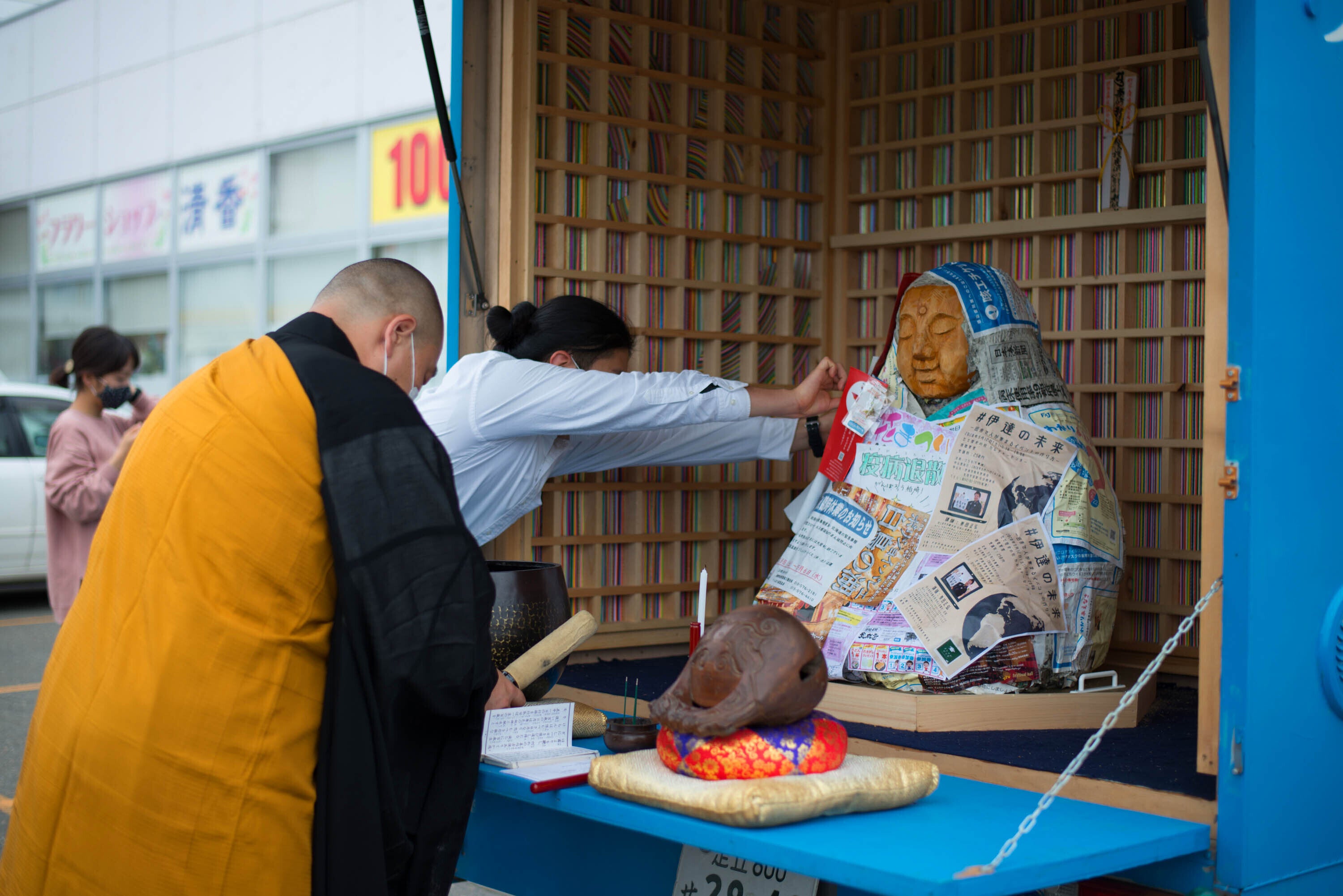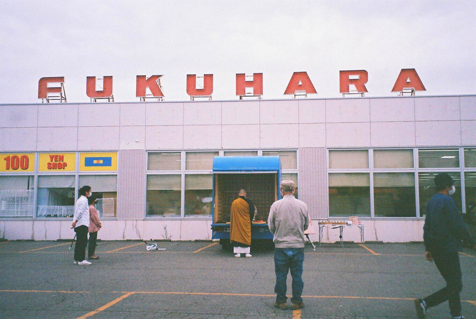 博物館の展示を拝見したのち、持田さんが交渉し会場として用意してくれたスーパー「フクハラ浦幌店」の店長にご挨拶。15時から駐車場にて法要を行いました。お寺以外でのイベント開催は初です。このような形も想定していたので、車に積んでおいた自前の「木魚」や「鐘」を使って、お経を唱えさせていただきました。