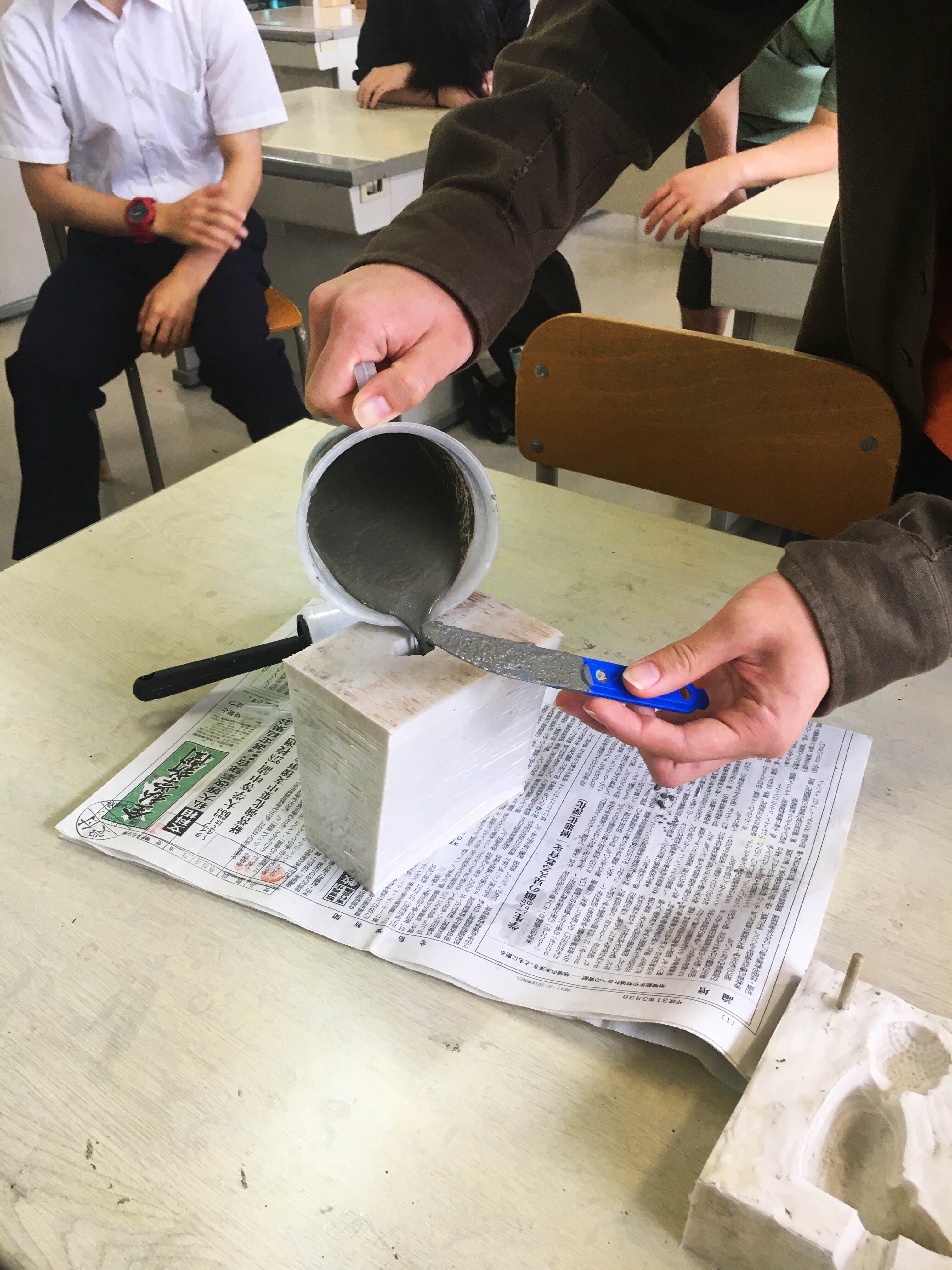 16日は、僕が教えている高校の授業があり、そこで前田さんに授業を行ってもらいました。内容は、「型取り」です。ミニ大仏で使っていた道具を用いて、生徒にもコンクリートでの型取りを体験してもらいました。型取り体験の後は、生徒と交流しましたが、札幌の高校生が興味をもったことは、意外にも前田さんが話す関西弁。結局、後半は前田さんの関西弁講座になりました。