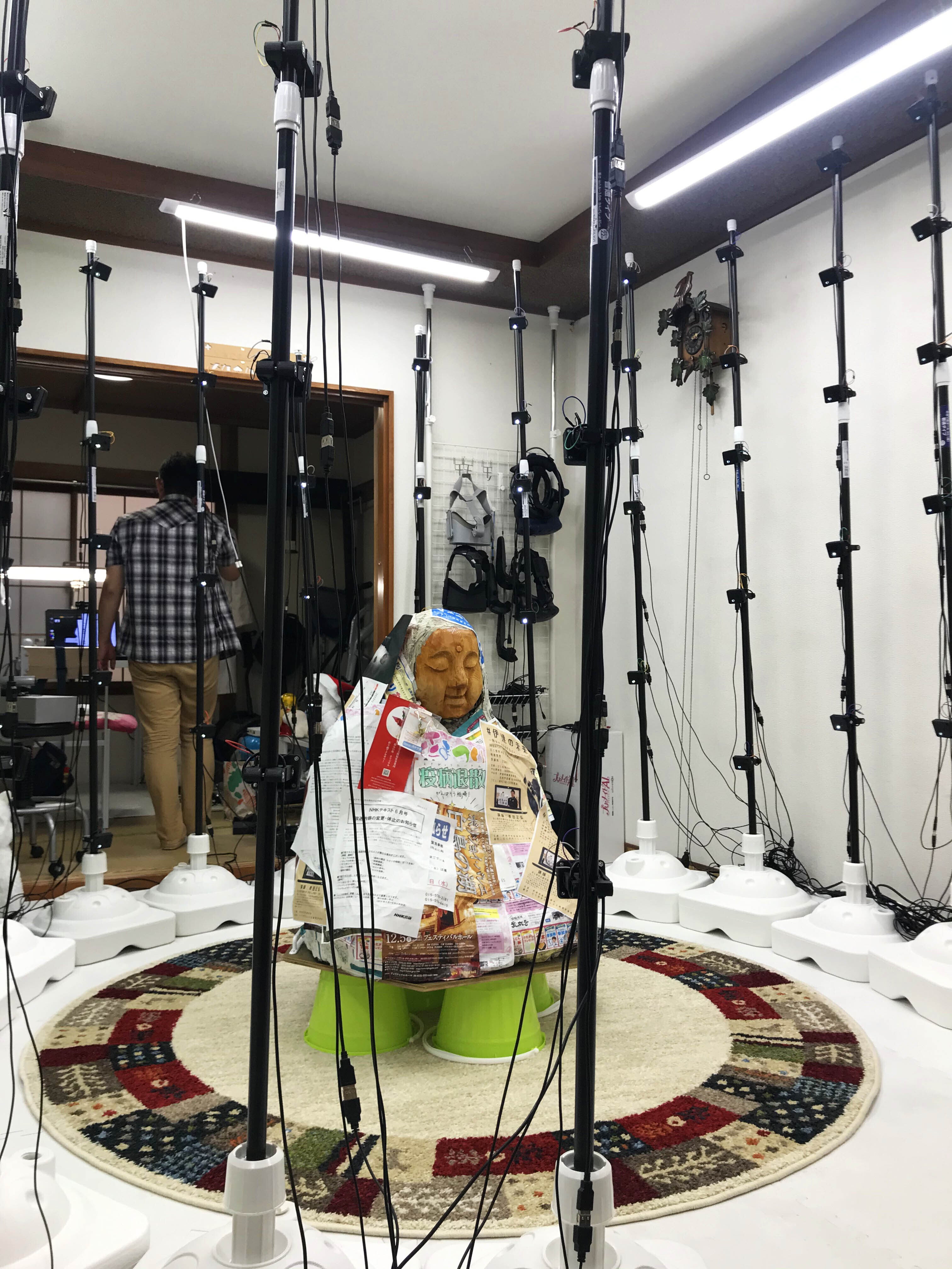 その日は夕方から、もう一つの予定がありました。以前にも紹介したVR屋のイエノブォーリーさんと、ARの打ち合わせです。イエノブォーリーさんの知り合いのスタジオに、360度の写真をまとめて撮れる装置があり、これを使えばなんでも3Dデータに残すことが可能です。この技術を大仏にも使えないかと思っており、他にも3DやVRで大仏の完成イメージを共有する方法を話し合いました。この日は、勧進仏像を撮影して3D化しました。