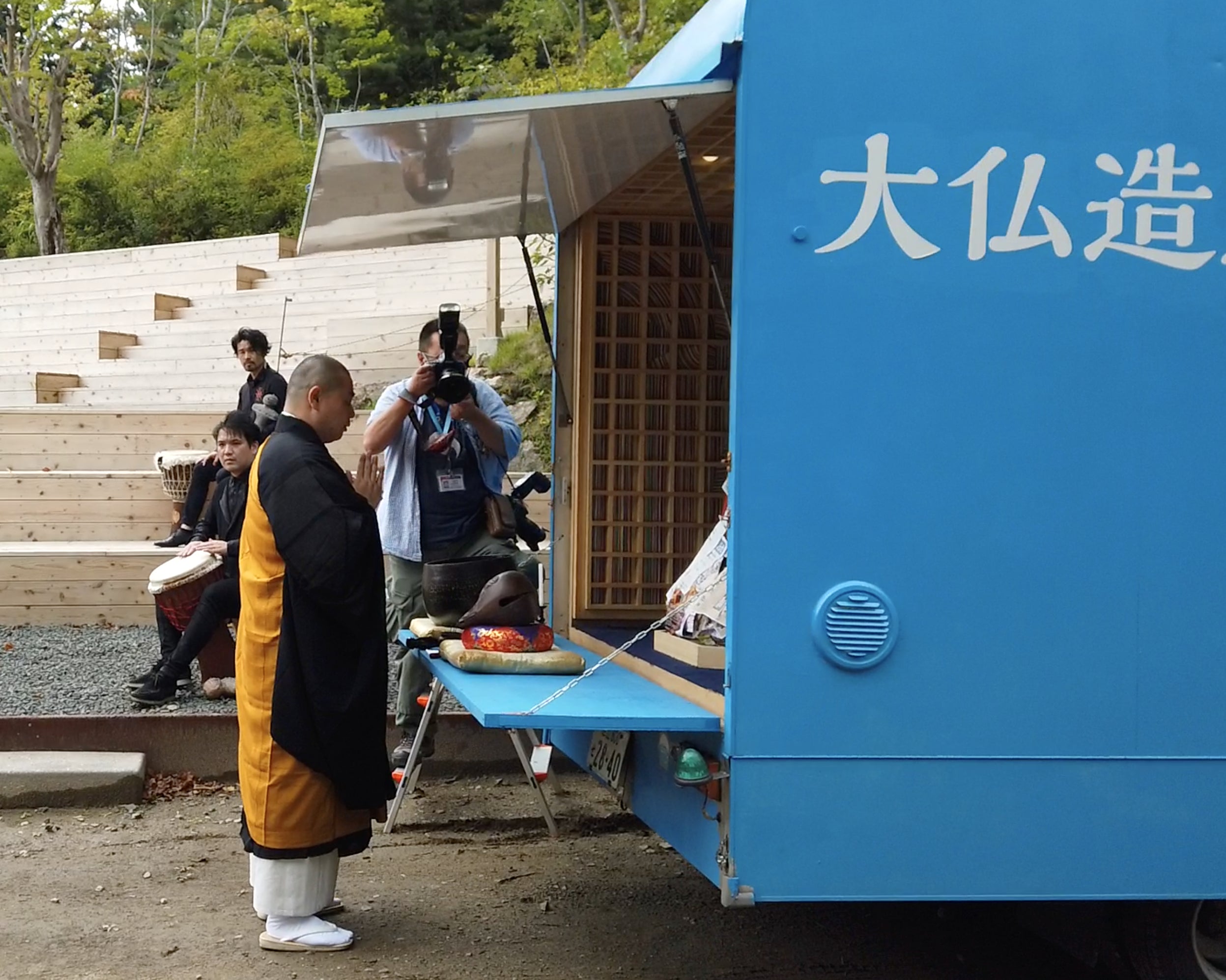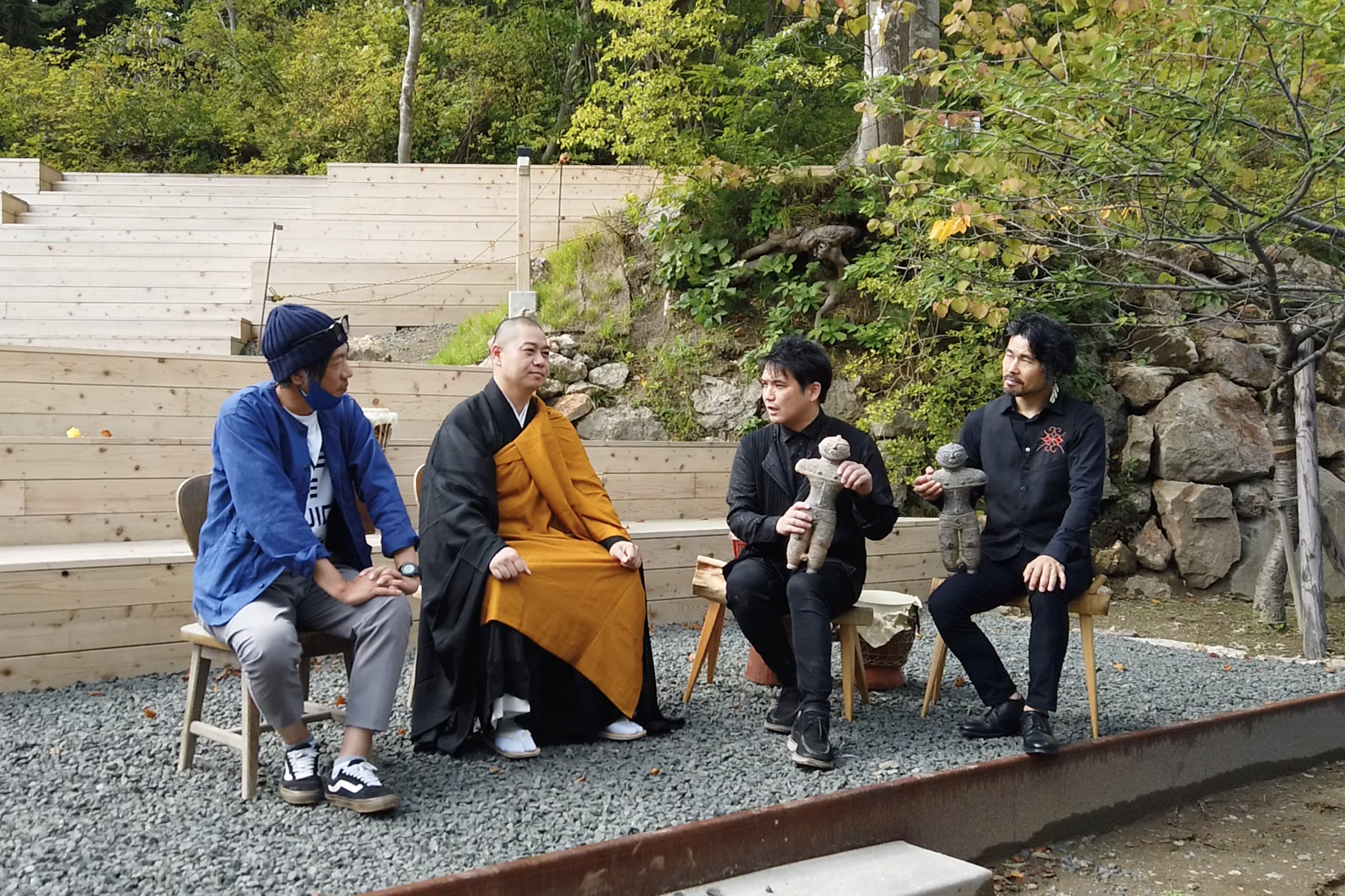 法要の後に、お二人と対談をさせていただきました。茂呂さんたちも今年の演奏活動はこれまでずっと中止になってしまったそうで、やっと少しずつ再開してきているとお話してくれました(2020年9月現在)。4000年前に作られた土偶を例に出して、人間はそんな大昔から「腹の足しにならないもの」を作っていた。それは人間の根本的な欲求であり、この時代にも同じように人間ならではの創作欲求として「大仏造立」を一早く思い立ったことに敬意を持ったことを伝えてくれました。