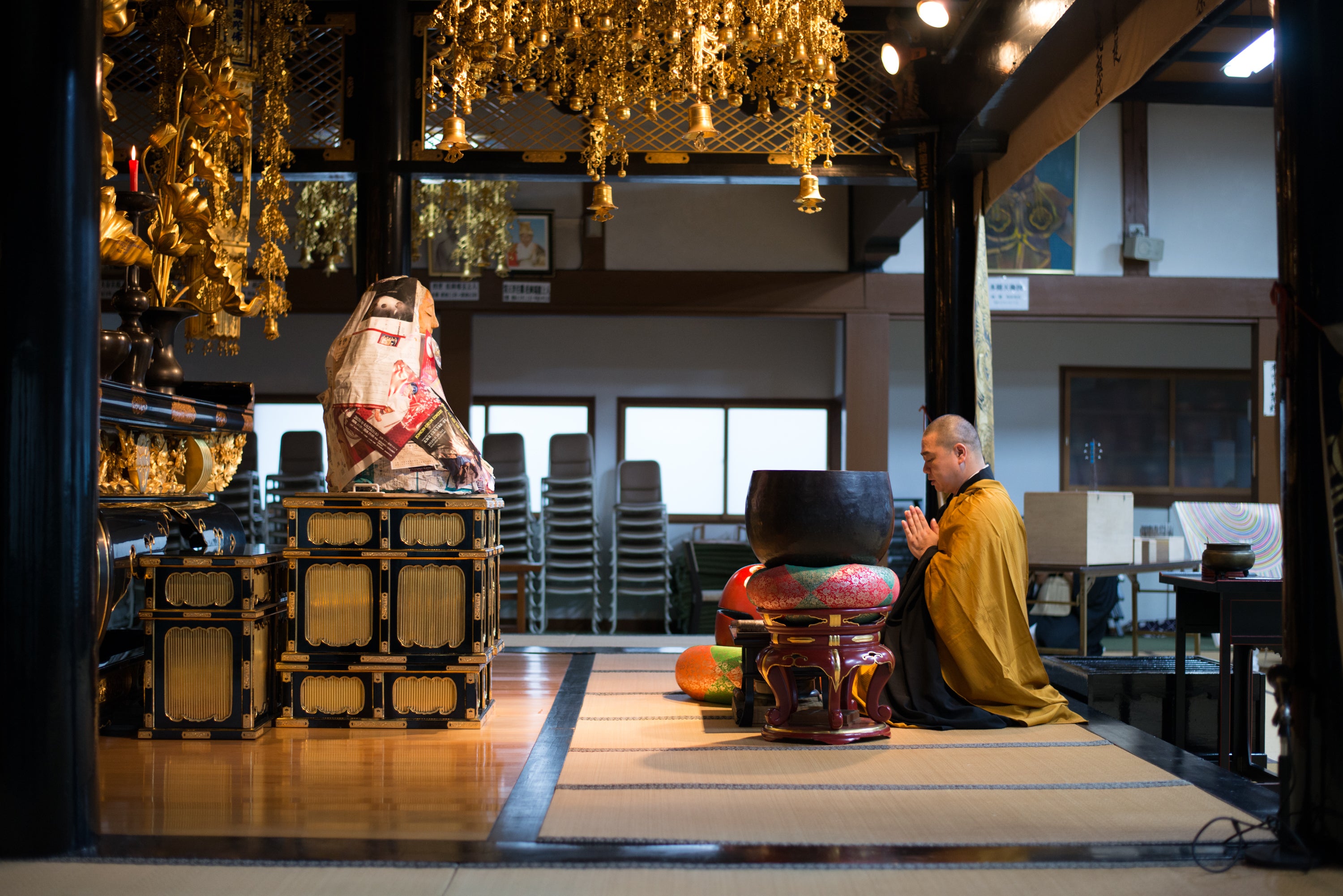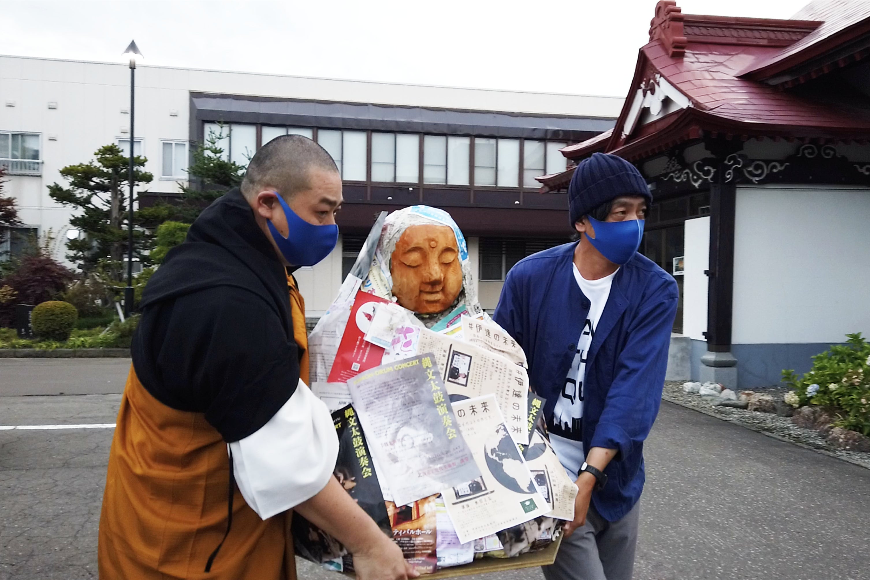 会場に到着して打ち合わせを終えると、勧進仏像、法要道具、作品、販売物、AR用のパネル、募金箱などを手分けして運び入れます。今回は僕の方で法要をとり行わせていただきました。数名ではありましたが参加してくれた方に、勧進仏像にチラシを貼ってもらいました。