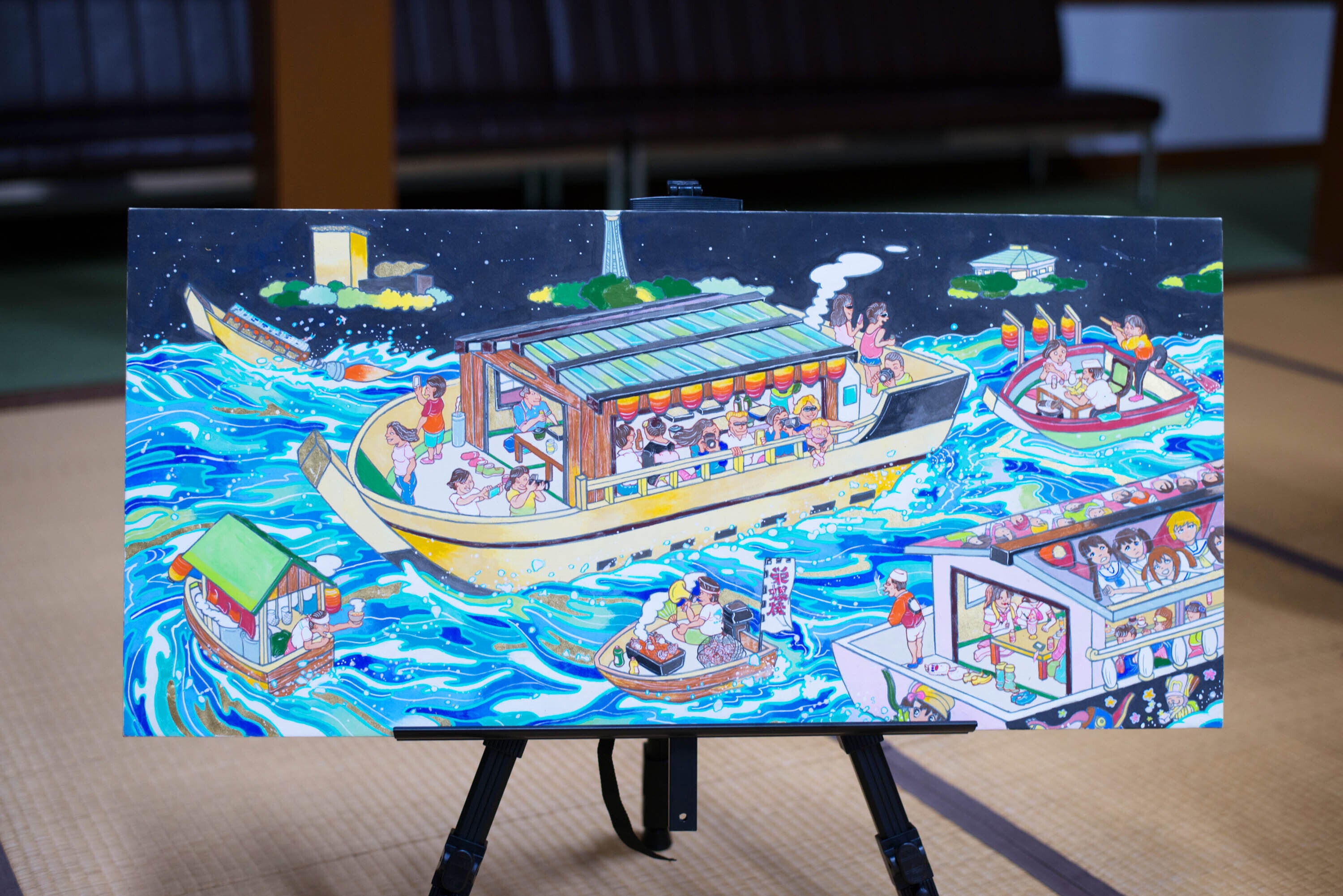 配信映像にはあまり映っていないのですが、いつも会場にはGermanSuplexAirlinesの作家の作品を並べています。お寺で開催する場合は、本堂の空いている場所に「絵画」や「立体作品」をおかせてもらいます。画像は海野良太の作品。今回のキャラバンは、自ら「仏像」や「法要」をお届けする目的の他に、「アート作品をお届けする」という趣旨もあります。この時はまだ3密の対象となる美術館に入りにくい風潮があったため(今は予約制などの対策をとり、開館され始めています。)、せっかく移動するなら「アートを鑑賞できる機会」も一緒にお届けしようという思いから、大仏カーには作品を積んで動いています。