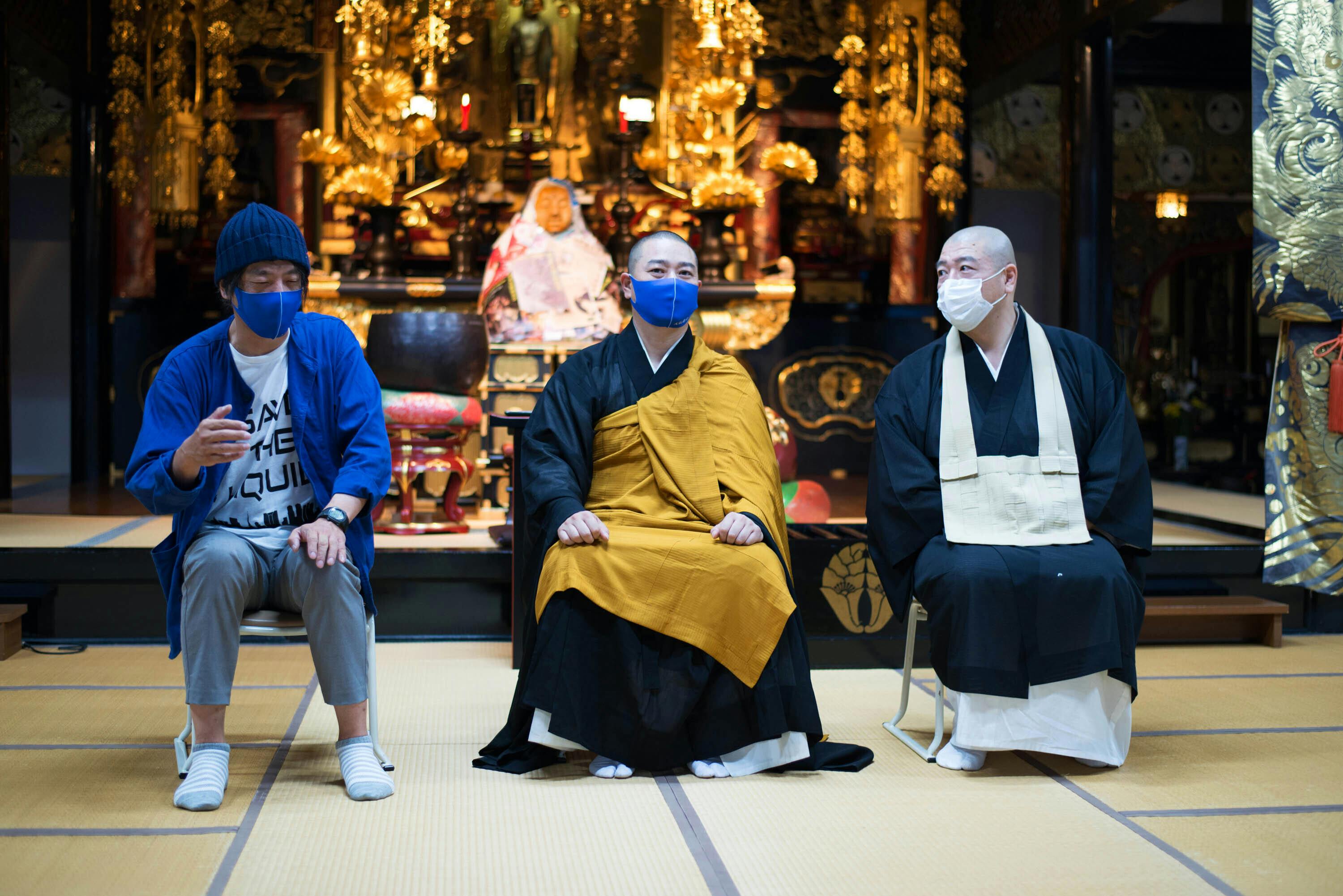 法要後に、松岡さんを交えて対談を行いました。プロジェクトの概要をお話したのちに、松岡さんから「たしかに大仏は仏教のものだが、意外とお寺からは出てこない発想なので感心した。」「宗派を飛び超えて行われる活動に広がりを感じた。」「何よりも、勧進キャラバンやクラファンという形をとることで多くの人が携わることができる、それがこのプロジェクトの一番重要な部分。」など、率直なご意見を伺うことができました。