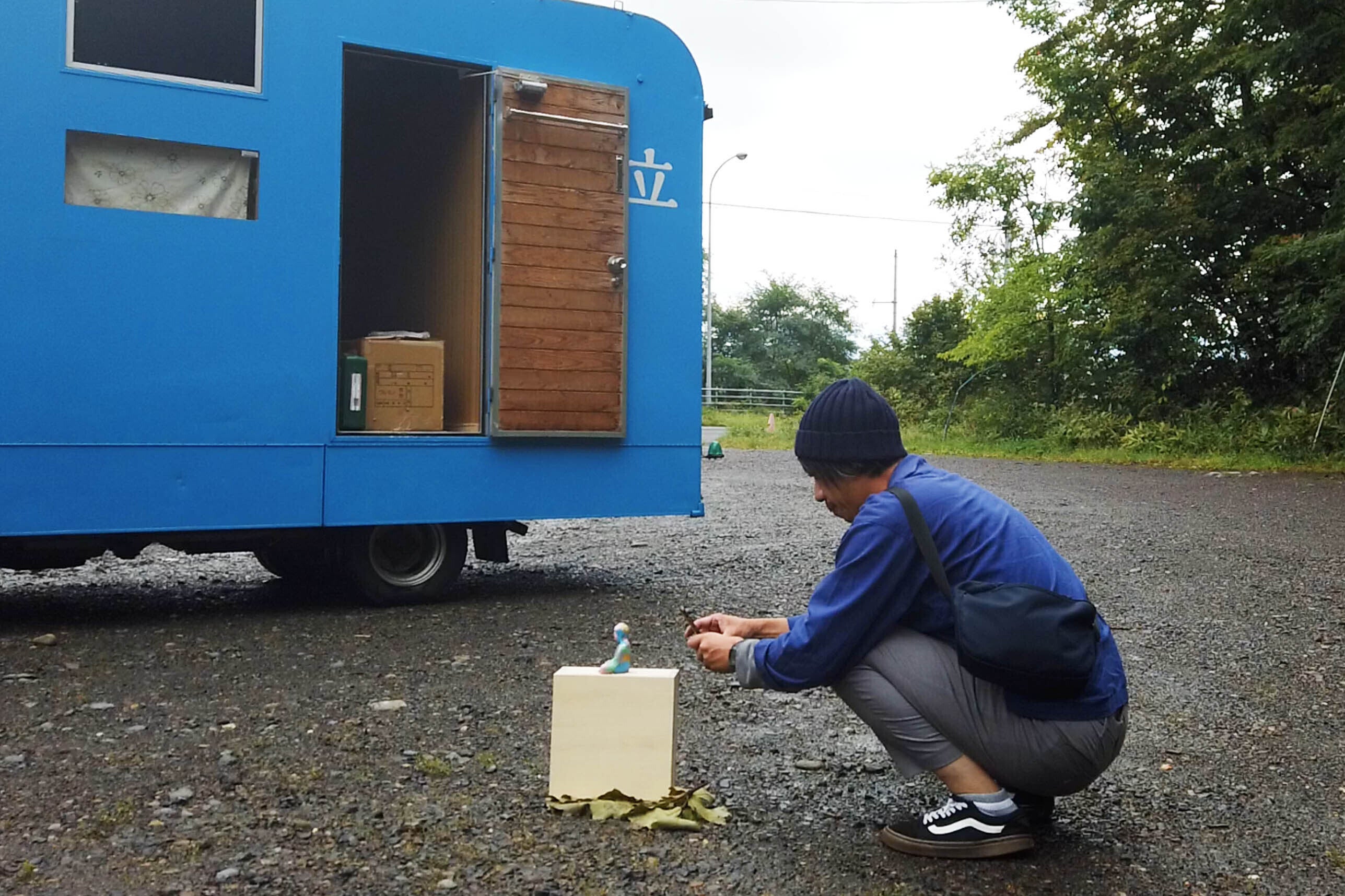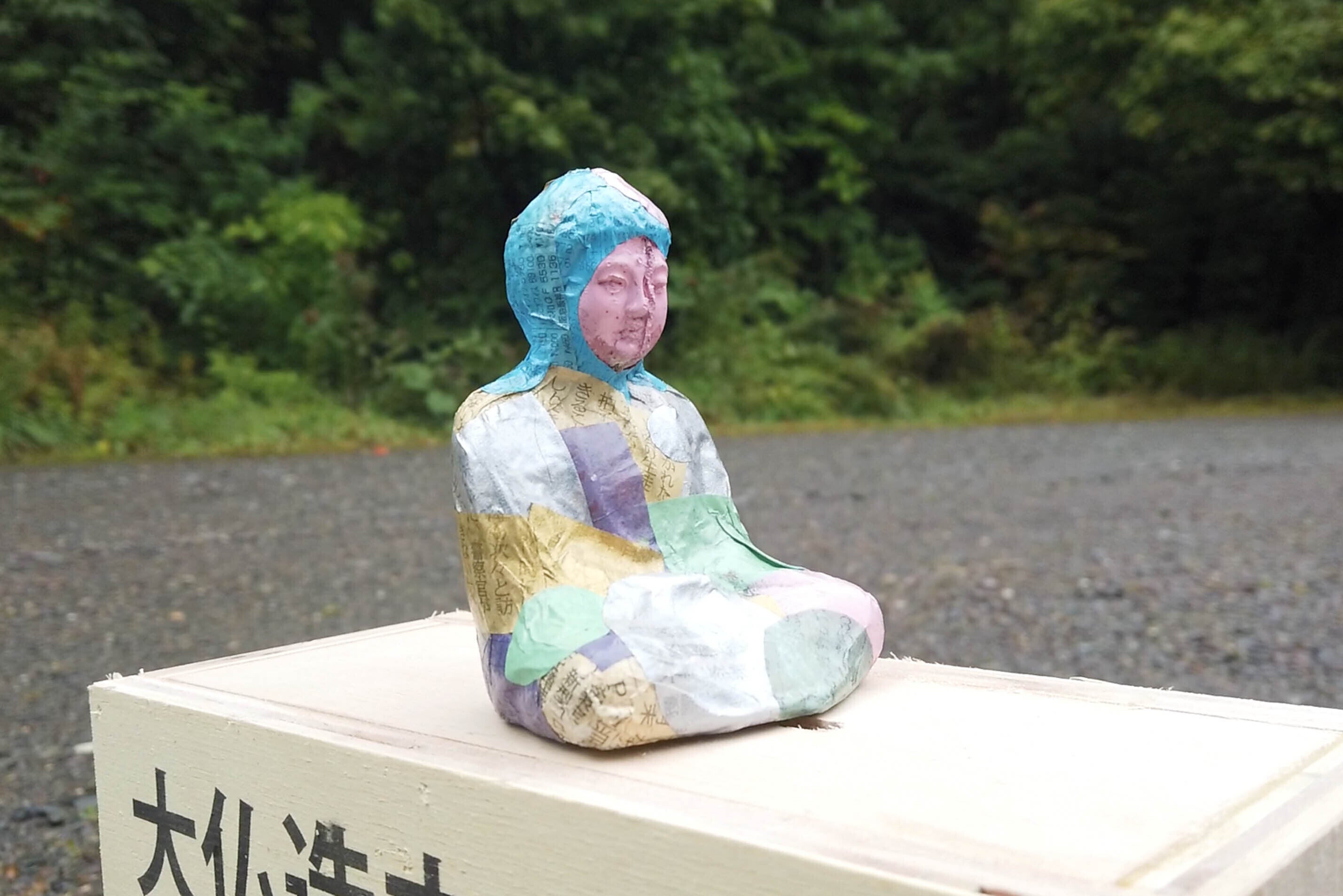 前田さんが何やら屈んで写真を撮っています。これは「AR大仏」のために、こまめに行っている撮影です。たびたび触れている「AR大仏」とは、スマホでQRコードを読み込むと、(スマホの画面上では)目の前に大仏が現れるというものです。「AR大仏」は、会場によって違った大仏が現れるようになっています。