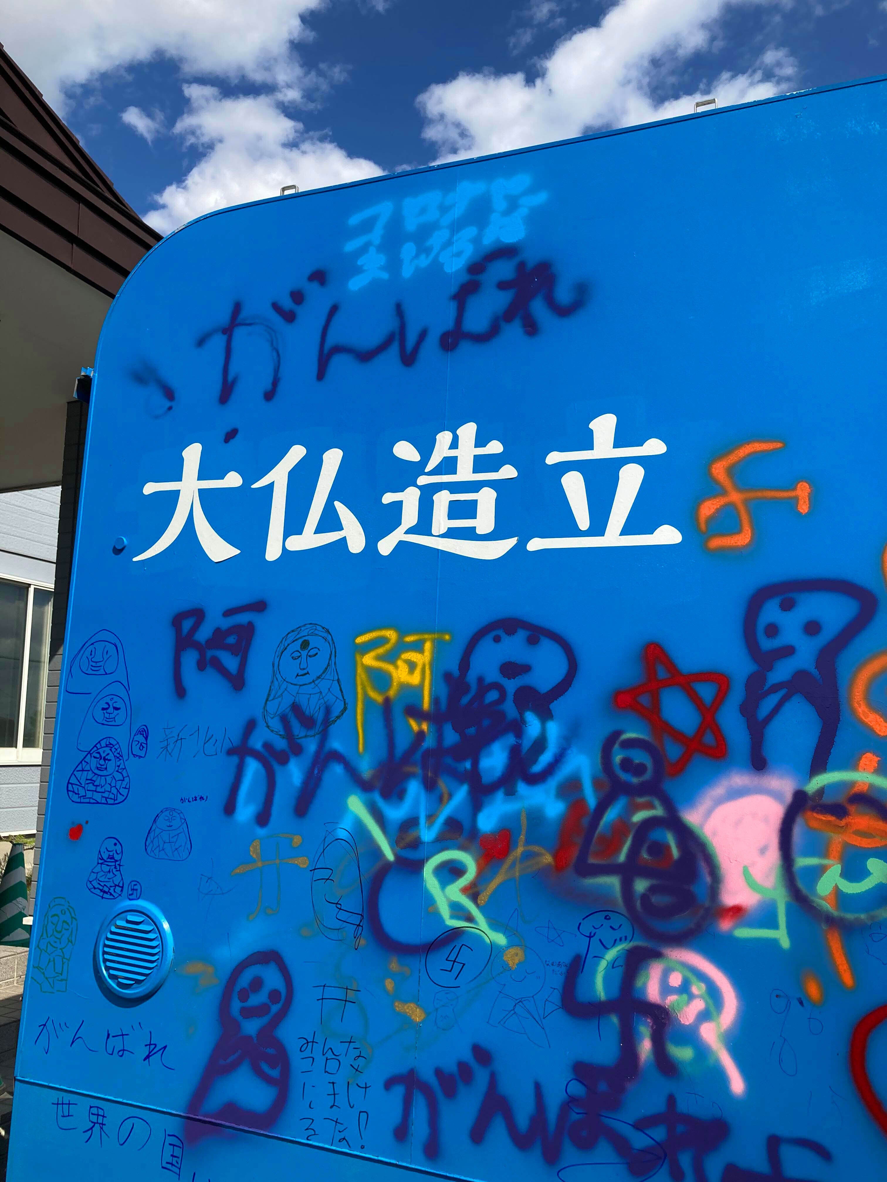 この日も非常に良い天気だったので、子供たちに装飾してもらった大仏カーが青く輝いて見えます。もともとDIY感のある車体は目立つのですが、さらに遠くからでも瞬時に判別できる車になりました。そもそも車体を青くしたのに明確な理由はないのですが、青空の下を颯爽と走るイメージを描いたら、自然に「青」を選んでいました。いつか快く出かけられる日が来ることを願い、上(空)を向いて歩くためにも、この青が適切だったと感じています。