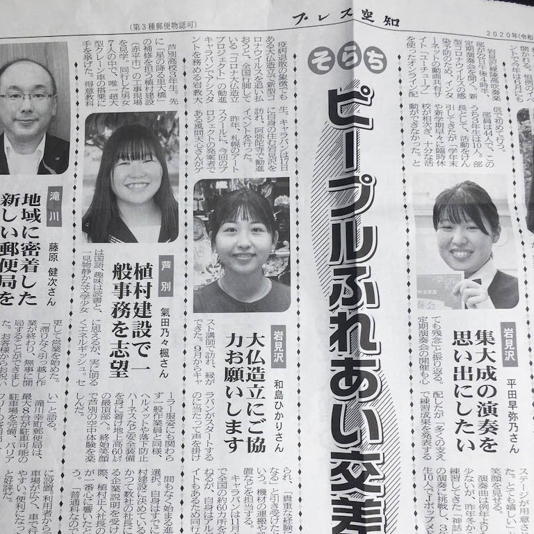 この日、松岡さんがある新聞を急いで持ってきてくれました。松岡さんは岩見沢会場のお寺さんです。岩見沢で取材してもらった「プレス空知」にキャラバンメンバーのワジーが載っていました。キャラバンではたくさんのメディアに取り上げていただいたのですが、その多くが、僕たちが出立したあとに記事になるため、特に地方紙は内容を確認できていないものもあります。もし他にも把握できていないものがあれば、ぜひお知らせください。