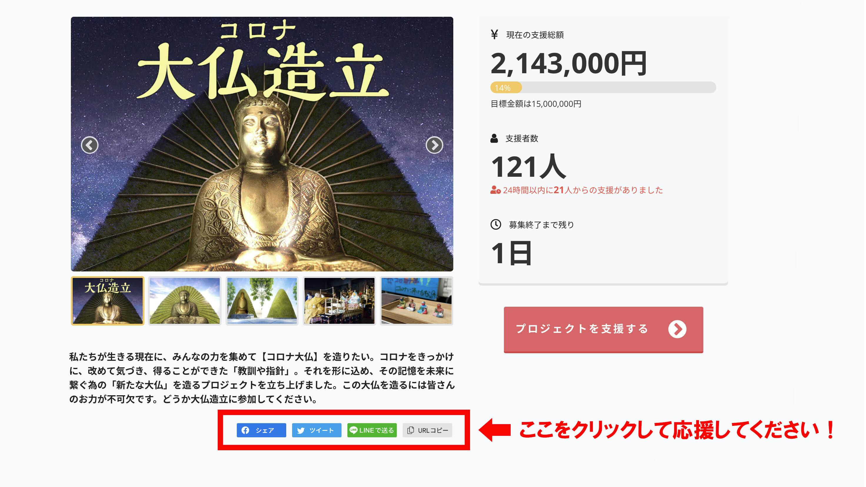 1月24日(日)はクラウドファンディング最終日となります。目標金額に達しなくても、なんとか造立しますので、より多くの方々に支援いただけるよう、ご協力をお願いします!