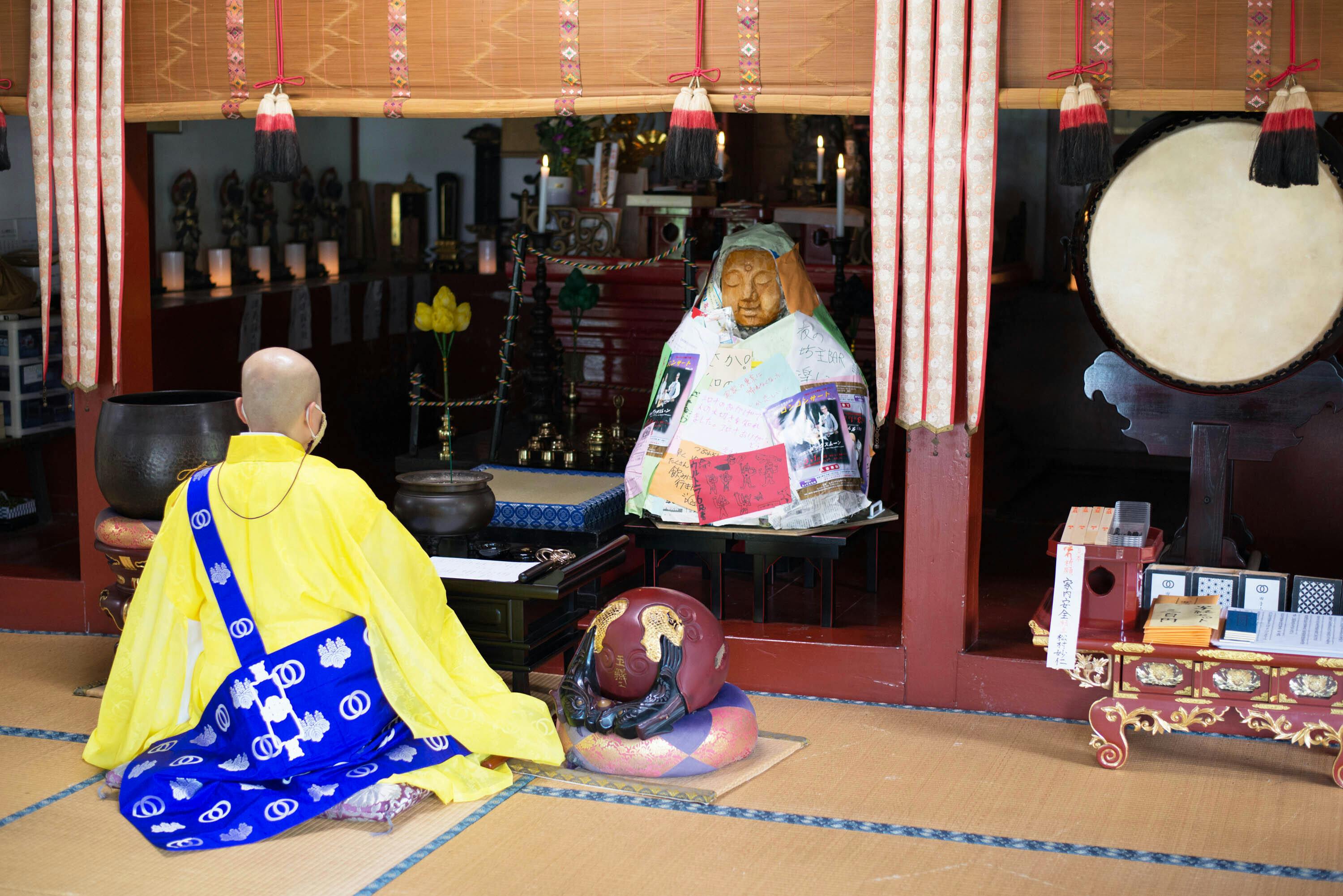 法要は、ご住職の松村さんに執り行っていただき、般若心経を一緒にお唱えいたしました。こちらのご本尊は、災禍をなくし病を治癒するご利益のある「薬師如来」。「疫病退散、疫病罹患者の平癒安寧、コロナ大仏造立プロジェクトの成満、道中安全」等々を祈っていただきました。