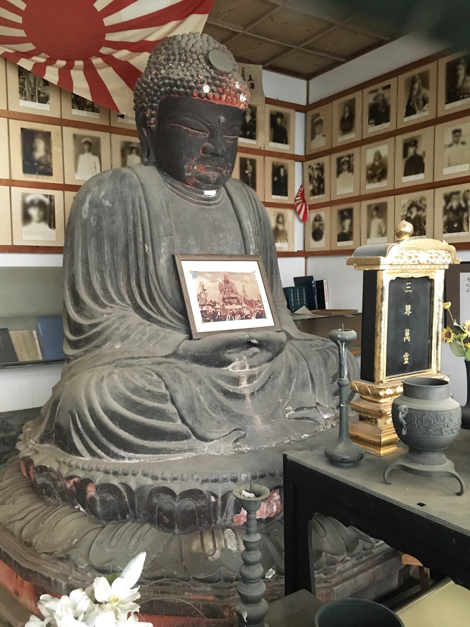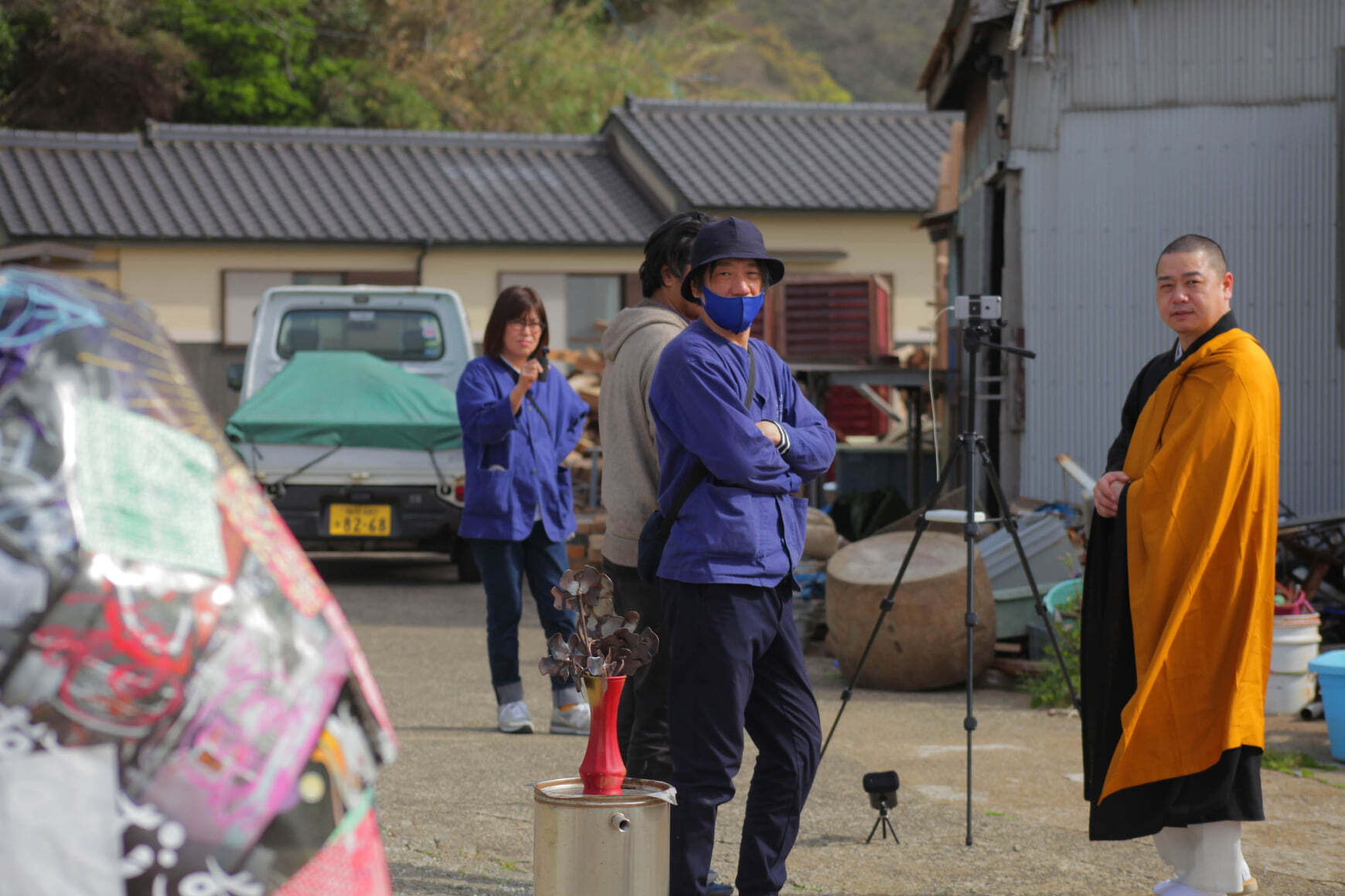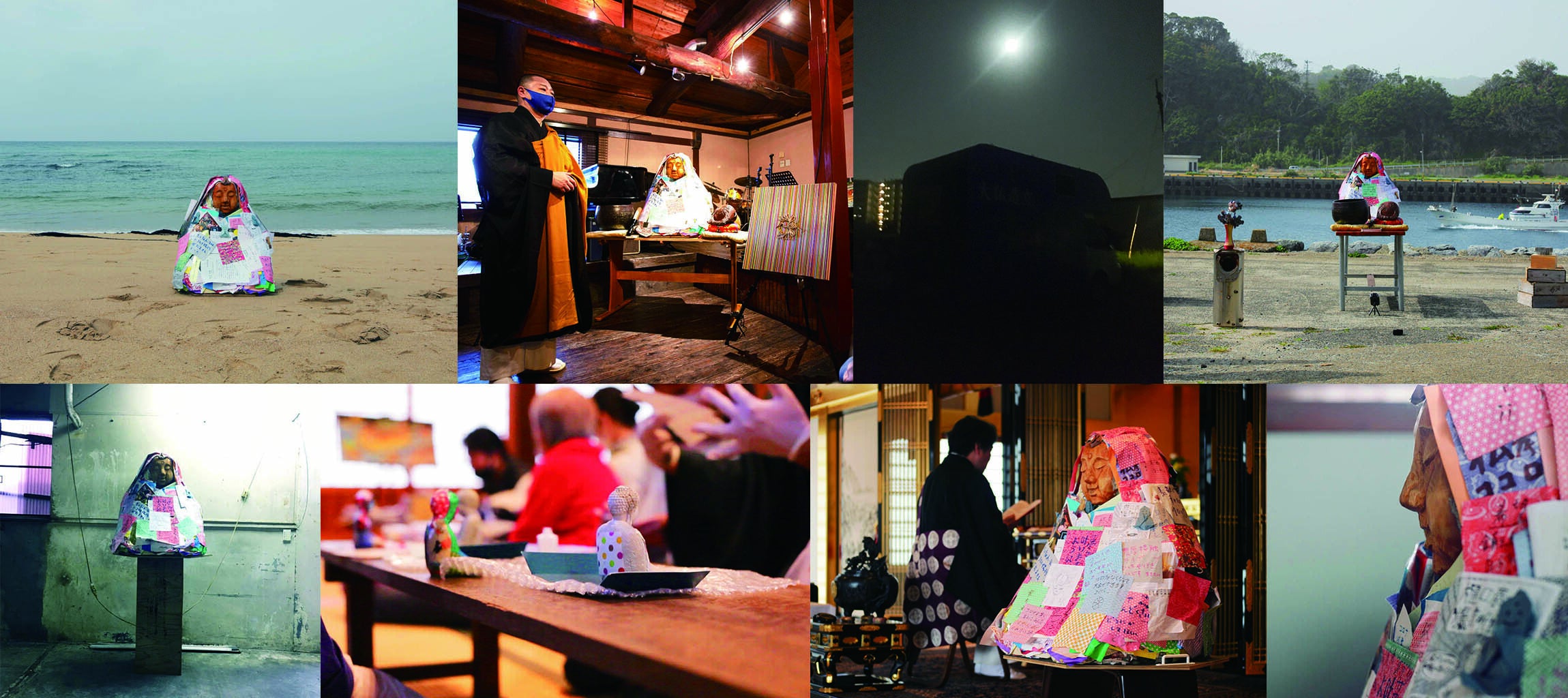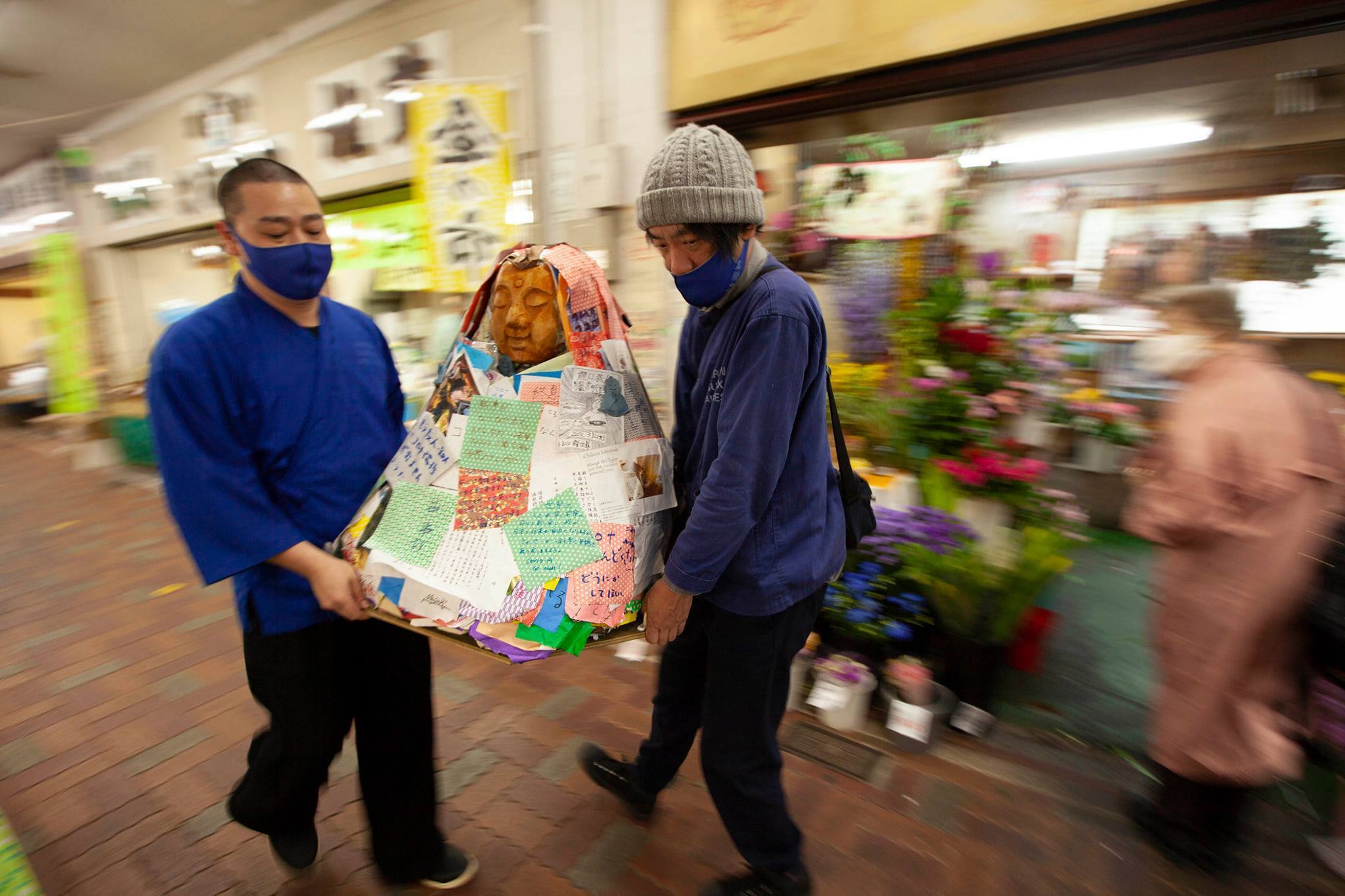 使わせてもらったお堂では、普段から千羽鶴にお願いごとを書く慣習が残っており、その流れで僕たちの仏像にも「」を貼ってもらいました。撮影は急遽かけつけてくれたカメラマンの「EMIA」さんです。