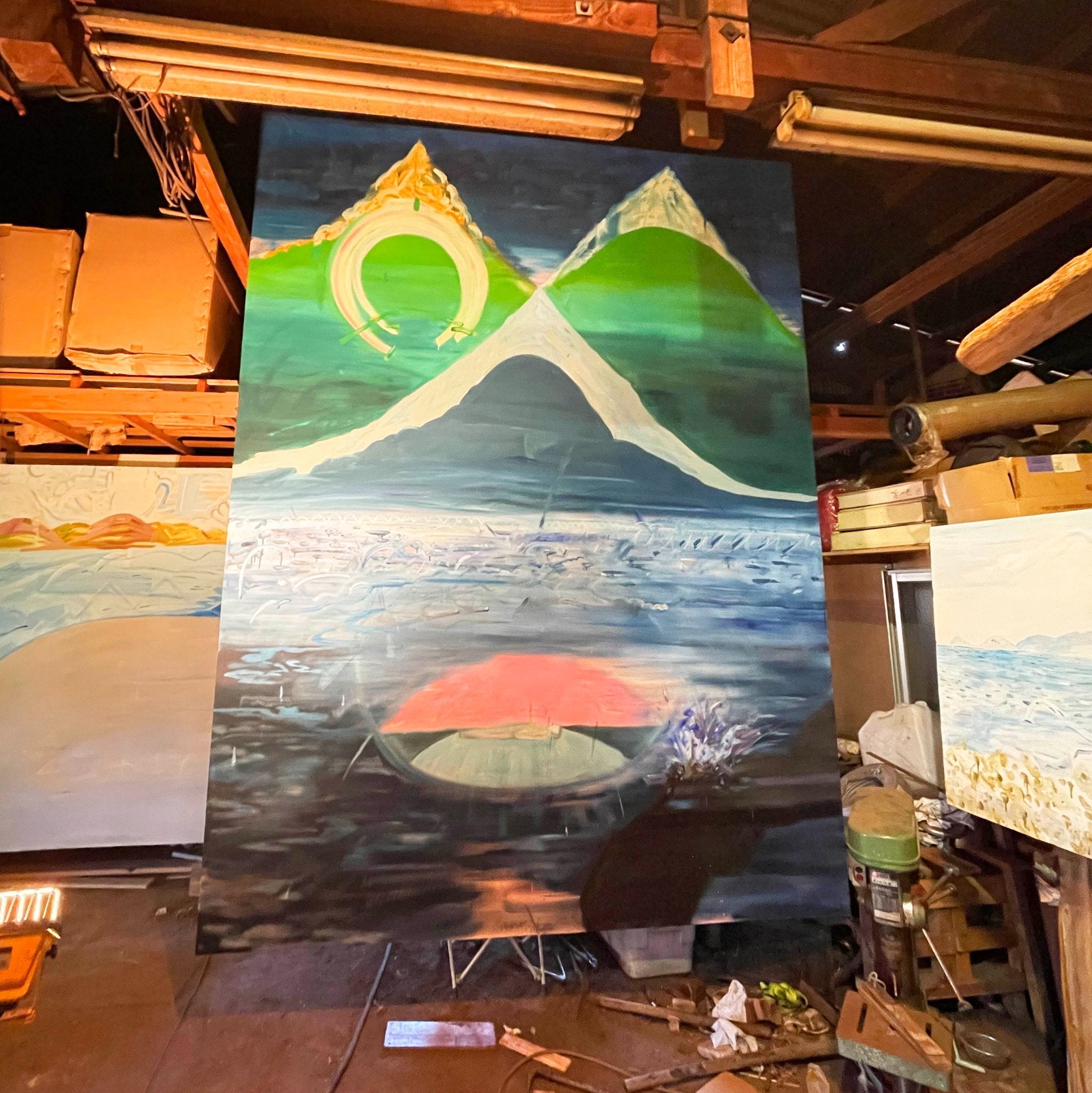 改めてお礼に伺った際には、ちょうどスタジオで加藤さんの展示が開催中。のんびりした空気の中にそびえる加藤さんの作品は見応え十分。九州のアーティストは横の繫りがあるようなので、地方同士の連携ができたらいいね、と情報交換。